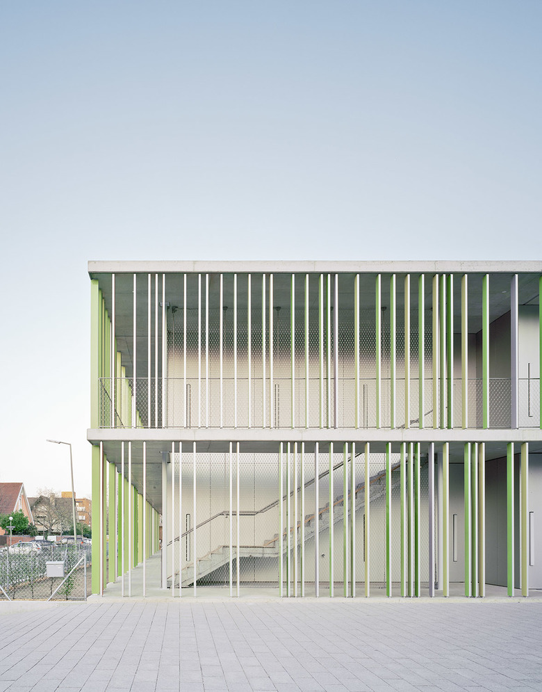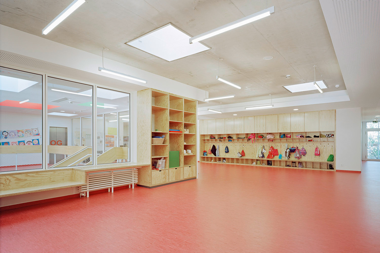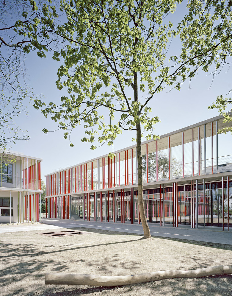 The design emerged from a competition (multiple commissions) and the two-storey primary school was developed on Montessori educational principles. The so-called learning building is typical of this: it was built in front of the classrooms in the form of generous, open usage areas.