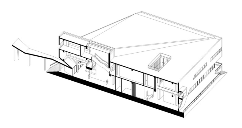 This site is surrounded by buildings with varying viewpoints of the main project. The multi-faceted box produces a façade of ever-changing viewpoints. The overall form and proportions of the building correspond to the program arrangement which includes a central atrium, models and media exhibition room, and ramps and stairs connecting different floors. The basic 6-sided volume is created from the merging and extruding of one small and one large square.