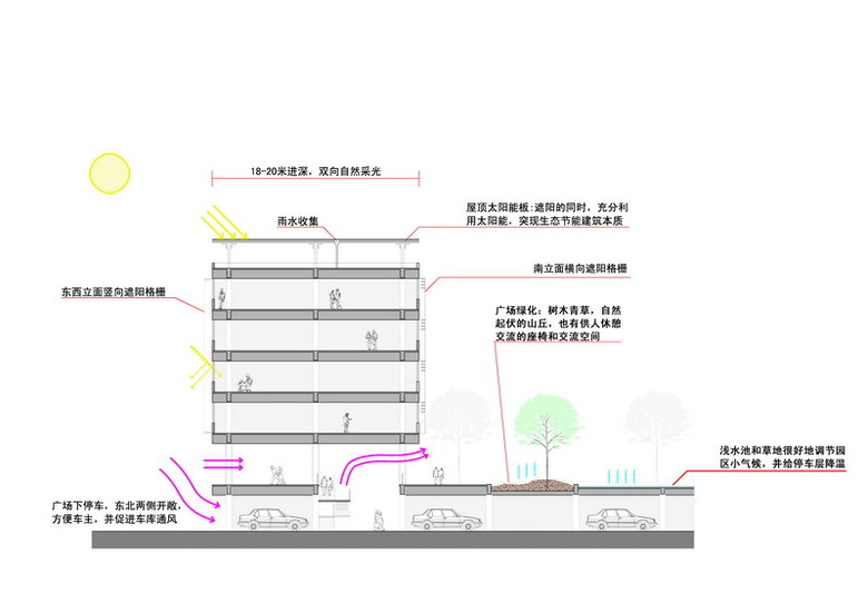 A number of sustainable design features were also incorporated, which include a 18-20m office depth to allow double-sided natural light; a covered walkway system on plaza level; trees, vegetation and shallow pools in the plaza to cool the underground garage; and roof shading devices incorporated with photo voltaic cells. The horizontal and vertical Brise Soleil visors stop high angle sun light from the south, as well as low angle sun rays from the east and west respectively.