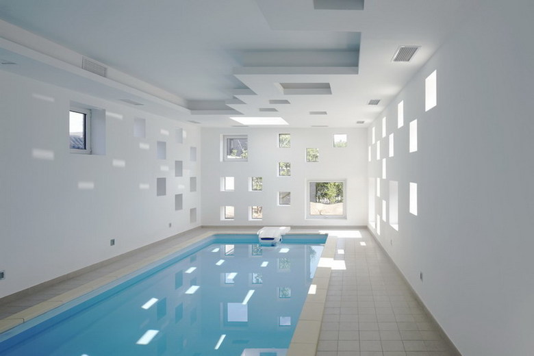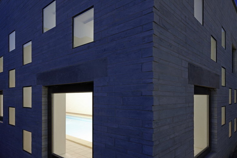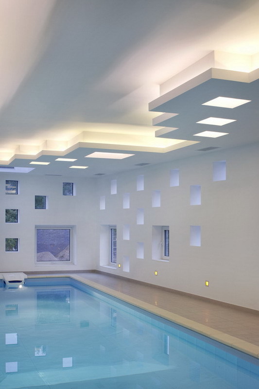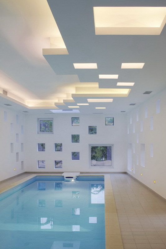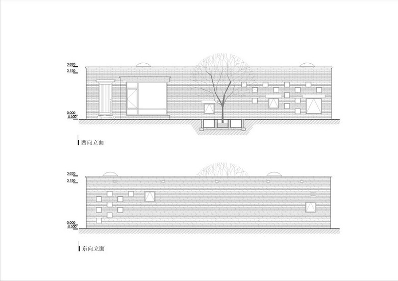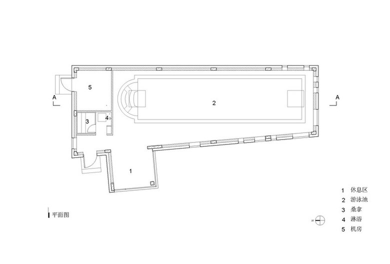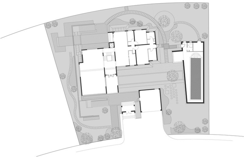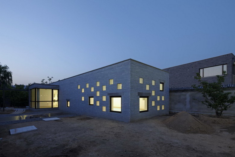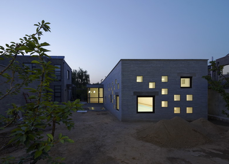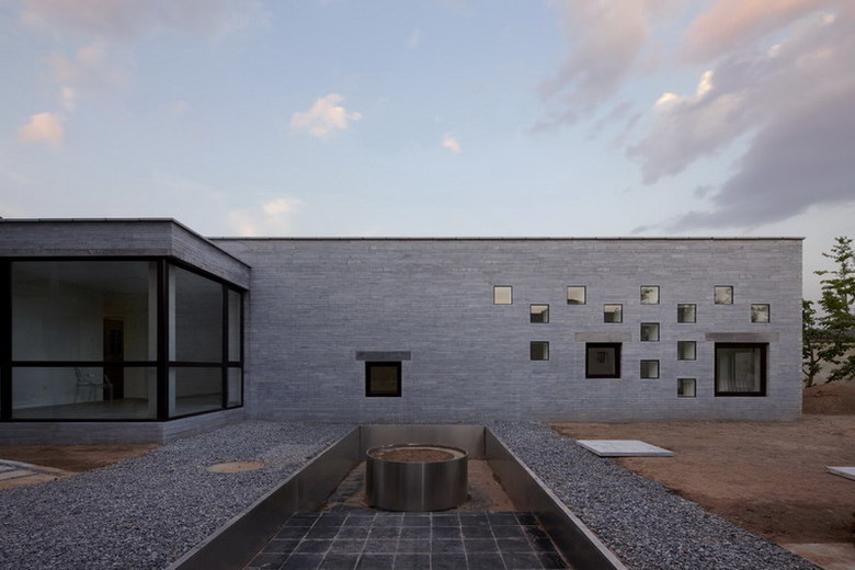 This site is at the foot of Fragrant Hill. It is a swimming pool annex next to the main housing area. The L-shaped form divides the outdoor space into two parts as a front and back courtyard. It also shields the courtyard from neighboring homes and the street. The exterior wall is cladded in stone from a local quarry. The skylights and windows of various sizes let in sunlight and reflect the passing of time during the course of a day and seasons of the year. Through these openings one can look upon the summer trees’ lush foliage and winter snows, further enriching one’s swimming experience.