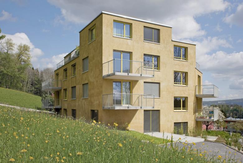 Ein Kernthema des Entwurfs ist die Materialisierung, welche weitestgehend mineralisch gewählt wurde, um zu gewährleisten, dass möglichst keine  Beeinträchtigungen der Mieter entstehen können. Um eine Verzerrung des natürlichen Erdmagnetfeldes ausschliessen zu können, ist erstmals im Wohnungsbau ein Haus grossmehrheitlich mit Glasfaserstäben armiert worden. Die Erschliessung mit den haustechnischen Medien ist konzentriert angeordnet, genauso wie Nasszellen und Küchen, welche ebenfalls negative Einflüsse auf die Bewohner haben können.