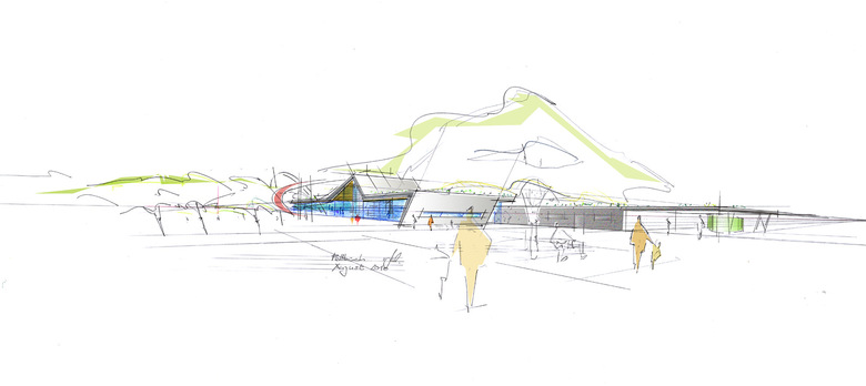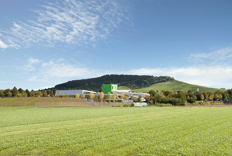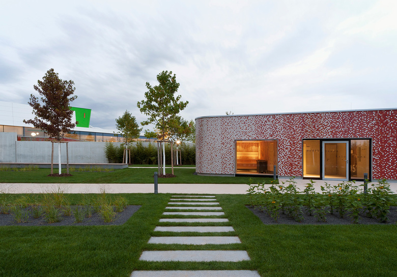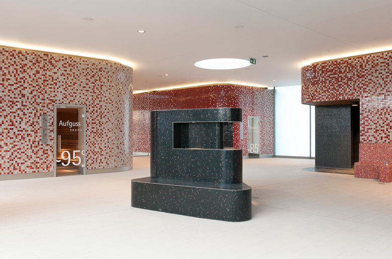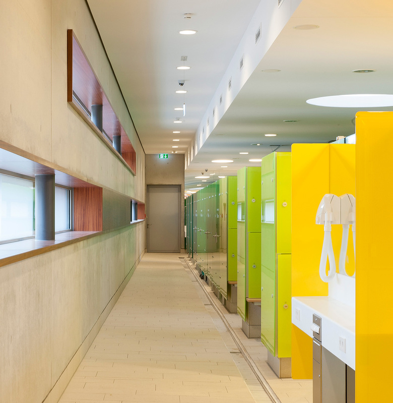 Die Lage des neuen Familien- und Freizeitbades F.3, am westlichen Stadtrand von Fellbach nahe des Kappelbergs, war Ausgangspunkt und Leitmotiv für 4a Architekten bei Form- und Gestaltgebung des neuen Bades. Als einer der bekannten Weinberge in der Region lieferte der Kappelberg und mit ihm das Thema Wein die Grundlage für das architektonische Konzept. In unterschiedlichen Facetten verkörpert das neue Familien- und Freizeitbad diese Thematik, angefangen bei der formalen Einbindung des Gebäudes in die Landschaft. Dafür haben 4a Architekten die linearen Weinbergstrukturen als Felder auf das Grundstück gelegt. Diese Felder bilden die Basis für die Entwicklung des Geländes: Beckenausrichtung, Liegedecks, Spielflächen, Baumreihen, Außensaunen – alles strebt zum offenen Feld hin und richtet seine Längsseite nach Süden aus. Daraus ergeben sich Schatten- und Sonnenbereiche, und der Blick der Besucher schweift in die Ferne. Aufgelockert wird diese klare Struktur von einzelnen Baukörpern, die teilweise in die Großform einschneiden. Während Beispielsweise Rutschenturm und Innensaunen das Gebäude durchdringen, sind Außensaunen sowie Kassenhaus und Kiosk für den Freibadbetrieb vom Baukörper losgelöst. Mit ihrer freien Form und scheinbar willkürlichen Lage greifen die Kuben die Struktur von locker eingestreuten Weintrauben auf. Darüber legt sich wie ein großes Badetuch die Dachform und bildet die unterschiedlichen Volumen ab. Diese Formgebung ermöglicht im Innenraum eine klare Aufteilung in drei unterschiedlichen Bereiche: Sportbad mit Freibad, Erlebnisbereich und Saunawelt. Auch in der Farbgestaltung herrscht Dynamik: Farbnuancen zwischen Hellgrün und Dunkelrot fließen durchs Gebäude – sie orientieren sich an den umgebenden Weinbergen im Wechsel der Jahreszeiten und weisen auf die unterschiedlichen Themenbereiche hin. Während warme Rottöne im Saunabereich und im Kinderbereich Wohlfühlatmosphäre erzeugen, greifen kühle Farben wie Grün und Gelb im Erlebnis- und Sportbereich das Thema Bewegung und Aktivität auf. Auch die farbige Deckengestaltung sowie die Glasspinde mit einem Farbverlauf von Grün zu Rot folgen diesem Prinzip.