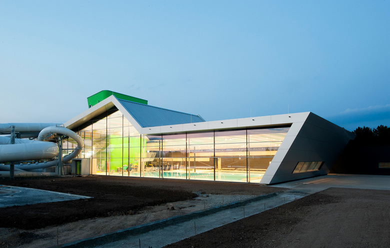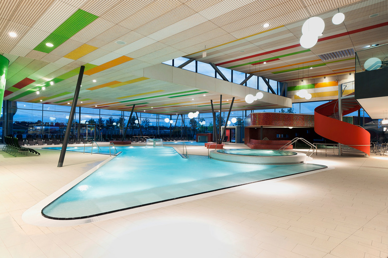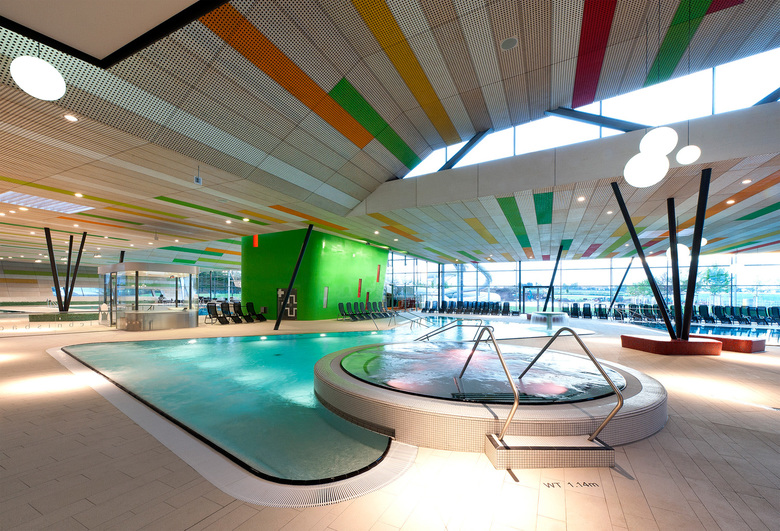 Am Schnittpunkt der beiden Gebäudeachsen befindet sich der transparent gestaltete Eingangsbereich – anthrazitfarbene Wandscheiben strecken sich von hier aus weitläufig in entgegen gesetzte Richtungen. Die offene Eingangshalle geht fließend in die geräumige Badehalle über, wo große Glasflächen ein Gefühl für maximale Transparenz erzeugen. Das Schwimmerbecken im Innenraum ist mit 25 Metern Länge wettkampfgeeignet und lädt auf 350 m2 zum ausgiebigen Schwimmen ein. In den Sommermonaten bietet das 50 Meter-Becken im Außenbereich den Schwimmern zusätzlich Bewegungsraum. Der Erlebnisbereich umfasst verschiedene Badeangebote: Ein großes Erlebnisbecken mit Sprudelliege und Wasserpilz, einen Whirlpool sowie ein 34 Grad warmes Solebecken. Mit einem Solegehalt von 1,5 Prozent, Sprudelliegen, Nackenduschen und Massagedüsen lädt es zum Entspannen ein. An das Solebecken grenzt ein Außenbecken mit Strömungskanal an. Ein Planschbecken mit Schiffchenkanal, Rutsche, Wasserblumen und Bodensprudler sorgt im Indoor-Kinderbereich für abwechslungsreichen Badespaß für die Kleinen. Dabei setzt die Gestaltung mit farbigen Mosaiksteinen heitere Akzente und erzeugt eine angenehme Atmosphäre. Optischer Blickfang und Highlight für Abenteuerlustige ist der grüne Rutschenturm, der auch von außen weithin sichtbar ist. Mit Turbo-Looping-Rutsche, Röhren- und Reifenrutsche bietet er Rutschvergnügen pur. Einen weiteren markanten Akzent im Innenraum setzt die Wendeltreppe in Form eines farbigen Zylinders. Sie führt auf eine Galerie mit Ruheliegen für die Badegäste. Ein Kontrastprogramm zum Erlebnisbereich mit seinen zahlreichen Attraktionen bietet die weiträumige Saunawelt. Warme Rottöne, haptische Materialien und eine stimmungsvolle Beleuchtung erzeugen eine Atmosphäre zum Wohlfühlen. Tepidarium, Dampfbad, Aufguss- und Trockensaunen sowie eine Biosauna laden zum Entspannen ein. Hohe Aufenthaltsqualität bietet auch der weitläufige Saunagarten, in den eine Salzsauna, eine Blockhaus-Kelo-Sauna und eine Rebensauna eingebettet sind. Ein Solebecken im Innenraum, Ruheräume sowie ein Kamin mit offenem Feuer und eine Saunabar ergänzen das umfangreiche Saunaangebot. Die gesamte Badewassertechnik befindet sich im Untergeschoss. Das Freibad mit großem Schwimmer- und Nichtschwimmerbecken und einladender Liegewiese wird im Sommer 2014 seine Pforten für die Badegäste öffnen.