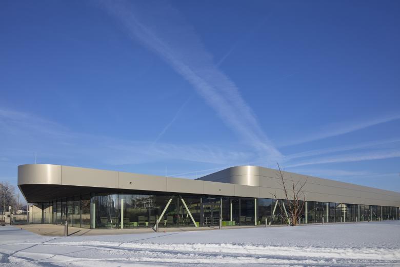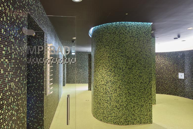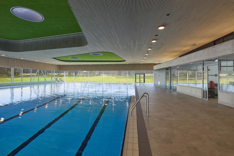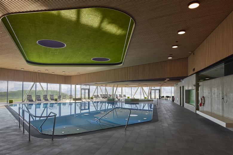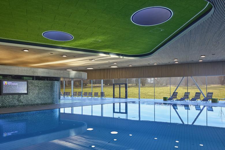 Im Zentrum des Gebäudes, zwischen Freizeit- und Sportbereich, befindet sich die Wellnesszone mit Dampfbädern, Erlebnisduschen und Ruheflächen. Verglaste Wände zwischen den unterschiedlichen Zonen ermöglichen eine gute Orientierung und erhalten das weitläufige Raumgefühl in der Badehalle. Im Innenraum verleihen freundliche, naturbelassene und robuste Materialien, die dauerhaft und pflegeleicht sind, dem neuen Hallenbad eine hohe Aufenthaltsqualität und Wohlfühlatmosphäre.