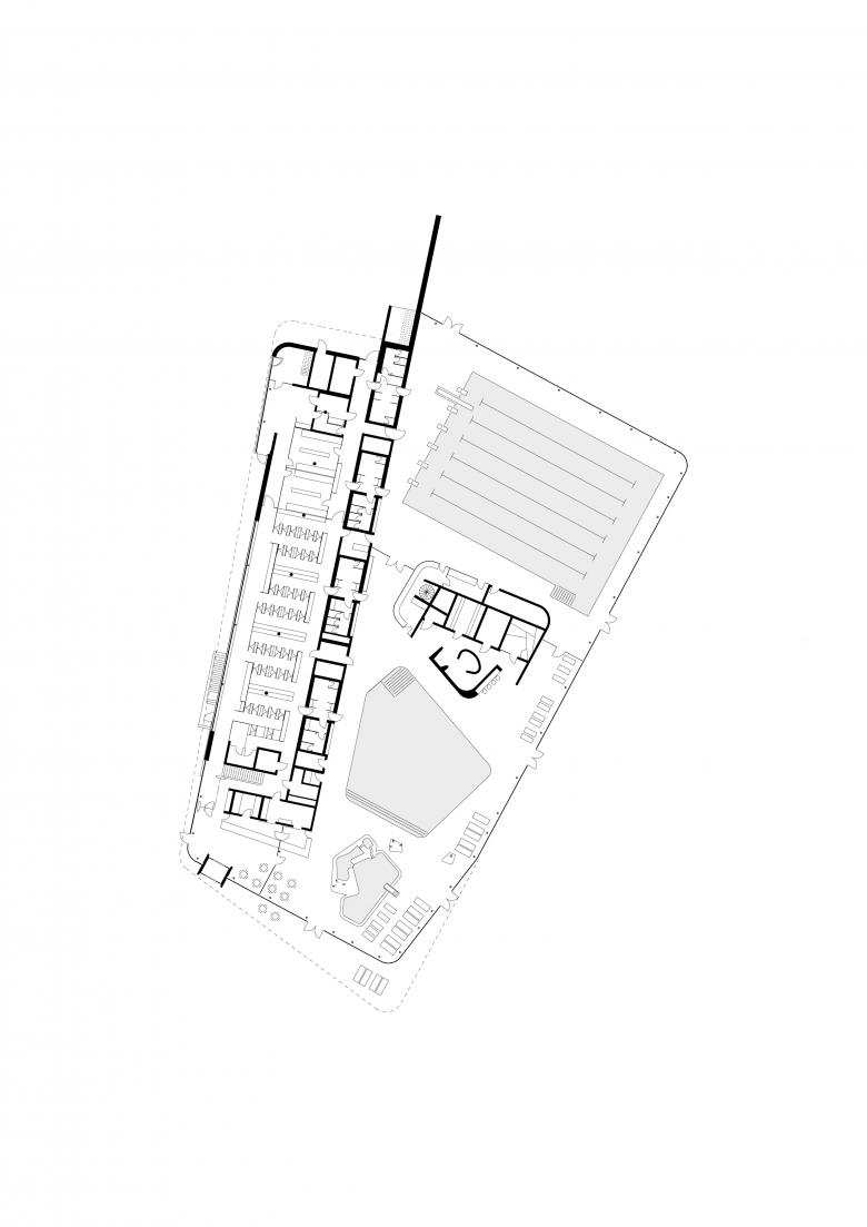Ein Mix aus klarer Formensprache und starken Kontrasten prägt das Hallenbad in Neutraubling. Von außen ist das Gebäude ruhig und geschmeidig gestaltet und gliedert sich in zwei flächige Volumen. Diese unterscheiden sich zum einen in ihrer Nutzung, zum anderen in der Raumhöhe. Der niedrige Baukörper nimmt Foyer und Umkleiden auf, die Badehalle ist den Anforderungen entsprechend höher gestaltet. Ein großzügiger Vorplatz markiert den Eingangsbereich und leitet die Besucher ins Gebäude. Parallel zur Straße angeordnet, bildet der Umkleideriegel einen schützenden Rücken zum gegenüberliegenden Friedhof und den Wohngebieten im Westen. Foyer und Umkleidetrakt schieben sich mit reduzierter Höhe in die unmittelbar anschließende, weiträumige Badehalle. Diese öffnet sich mit Sport-, Freizeit- und Wellnessbereich sowie Gastronomie großflächig nach Süden bzw. Südosten zum Außenraum.