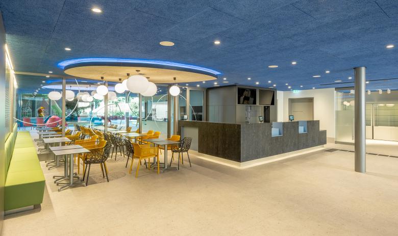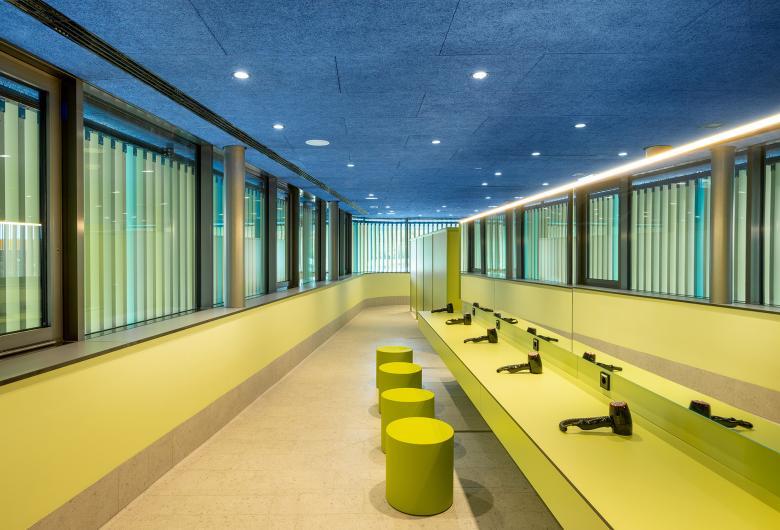 In direkter Nachbarschaft zur Eissporthalle entwickelten 4a Architekten als Generalplaner einen dreigeschossigen Baukörper, der sich kompakt in die bestehende städtebauliche Struktur einfügt und den verfügbaren Raum effizient nutzt. Das Main Bad umfasst rund 900 Quadratmeter Wasserfläche für Freizeit, Sport und Erholung. Der Entwurf zeichnet sich durch eine klare, reduzierte Formensprache aus. Geschmeidige Rundungen und ein Fassadeneinschnitt im Eingangsbereich verleihen der dreieckigen Gebäudeform Dynamik. Im Innenraum dominieren Fliesen, verputzte Flächen und akustisch wirksame Oberflächen, die nicht nur gestalterisch ruhig wirken, sondern sich auch besonders gut reinigen und Instand halten lassen. Das Farbkonzept setzt auf kräftige Blau-, Grün- und Gelbtöne, die für Lebendigkeit sorgen. Auch die Fassadengestaltung prägt ein ruhiges und strukturiertes Material- und Farbkonzept: Auf das begrünte Sockelgeschoss folgt eine gelochte und gewellte Aluminiumverkleidung, die von farbigen Metalllamellen und verglasten Elementen durchbrochen wird.