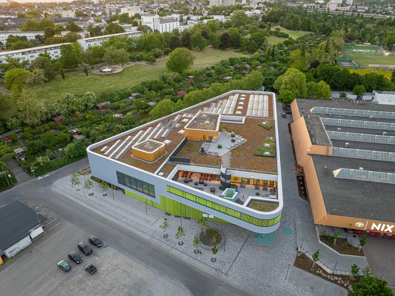 Das Main Bad überzeugt nicht nur architektonisch, sondern auch ökologisch. Bereits die kompakte, dreigeschossige Kubatur trägt zur Energieeffizienz des Gebäudes bei, da sie die Gebäudehülle im Verhältnis zum Volumen reduziert und dadurch Wärmeverluste minimiert. Öffnungen und Fassadenflächen sind im Hinblick auf Tageslichtnutzung, Energieeffizienz und thermische Performance optimiert. Dachoberlichter führen natürliches Licht tief ins Gebäudeinnere, verbessern die Aufenthaltsqualität und reduzieren den Bedarf künstlicher Beleuchtung; zugleich ermöglichen sie passive solare Energiegewinne.