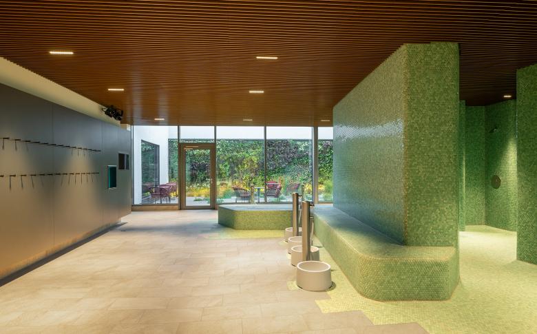 Das Obergeschoss umfasst eine großzügige Saunalandschaft mit fünf verschiedenen Saunen. Ein begrüntes Atrium sorgt für natürliche Atmosphäre, Tageslicht und hohe Aufenthaltsqualität. Ruhe- und Kaminzonen, ein Gastronomiebereich sowie ein Außenbereich mit Tauchbecken, Kaltduschen und Sonnenterrasse bereichern das Angebot. Im Dachgeschoss befindet sich zudem ein weiterer Ruheraum mit Ausblick auf die Umgebung.