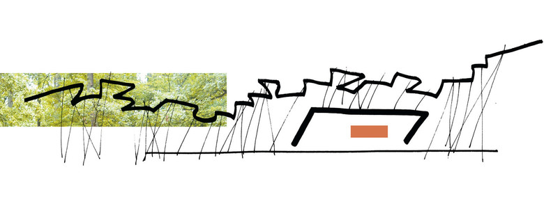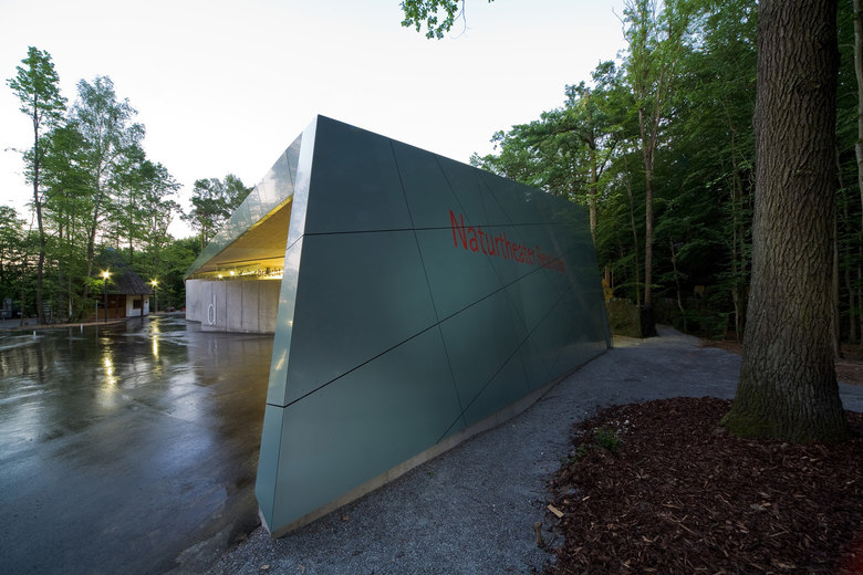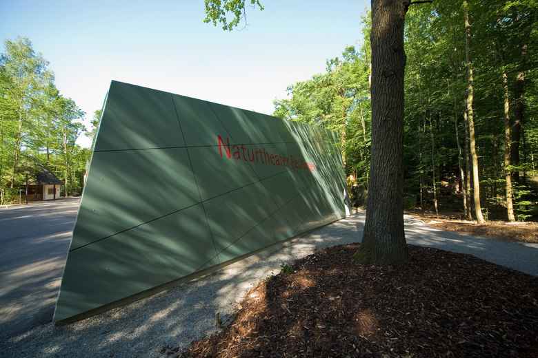 Die Zuschauerhalle mitten im Wald wurde ganz im Sinne der Bauherren „leicht, offen und modern“ gestaltet. In ihrer Bewegung symbolisiert die dynamische Bauform Wachstum und Veränderung – das Theater fügt sich als Teil der Waldlandschaft in die natürliche Umgebung ein. Die großzügige, selbsttragende Dachkonstruktion bietet rund 1.000 Sitzplätze für Theaterbesucher. Die grüne Färbung der Metallverkleidung verleiht der Konstruktion eine natürliche Anmutung. Schräg laufende Fugen in der metallenen Verkleidung folgen einer natürlichen (Un)Ordnung und greifen neben der Farbigkeit auch die Struktur des Waldes in der Fassade auf.
