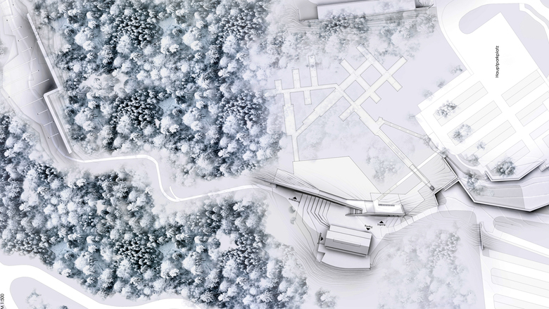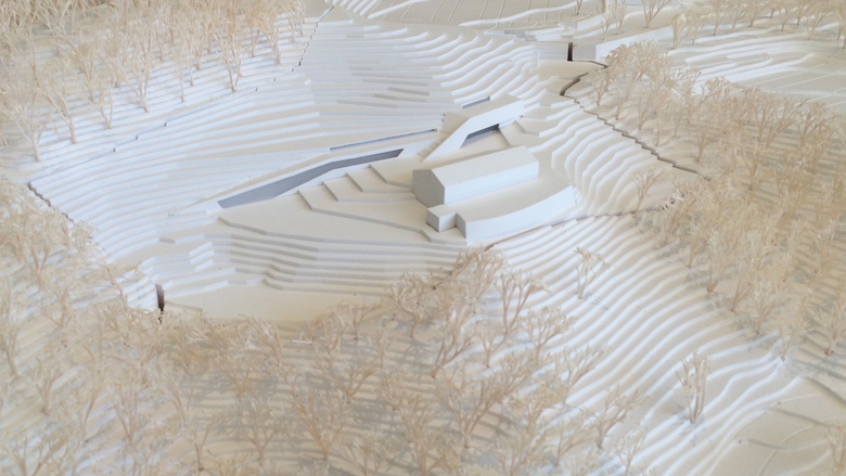 Die bestehenden Stützmauern werden thematisiert, Landschaftsschlitze strukturieren, gliedern und belichten das Projekt, von dem ein Großteil unterirdisch geplant ist.