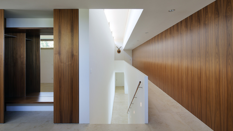 Das steile Grundstück Richtung Westen befindet sich oberhalb des Dorfkerns der Gemeinde Bildstein an einer kleinen privaten Zufahrtstraße. Dem Geländeverlauf folgend wurde das Haus in einen Schlaf- und einen Wohnbereich eingeteilt. Bewusst geschlossen präsentiert sich die Eingangshalle im Obergeschoß. Die nussholzfurnierte Wand auf der Galerie beinhaltet die Zugänge zu den privaten Zimmern des Bauherrn, sowie zu einem Gästetrakt im Süden. Von der Galerie im Obergeschoß führt die einläufige Steintreppe hinunter in das Wohngeschoß. Von hier aus eröffnet sich dem Besucher ein wunderbarer Blick über das gesamte Rheintal und den Bodensee. Ein offenes Wohnkonzept beinhaltet die Lebensräume Essen & Wohnen, der Kamin und das Wohnzimmer liegen auf der privateren Nordseite. Hier wurde auch keine raumhohe Glasfassade ausgeführt. Vielmehr wird der Blick Richtung Bodensee gerahmt durch die niedere Brüstungshöhe auf Sitzhöhe. Besonderes Augenmerk legte der Bauherr auf die Terrasse, hier ist der 13m lange, auskragende Pool der absolute Blickfang. Kein Geländer stört den Blick ins Tal, der umlaufende schmale Servicegang wurde so angelegt, dass er beim Schwimmen und auf der Terrasse nicht zu sehen ist: Wasseroberfläche und Himmel verschmelzen zu einer Einheit. Ebenso bleibt der Ausblick frei von Absturzsicherungen durch geschickt abgetreppte Pflanztröge aus Beton.