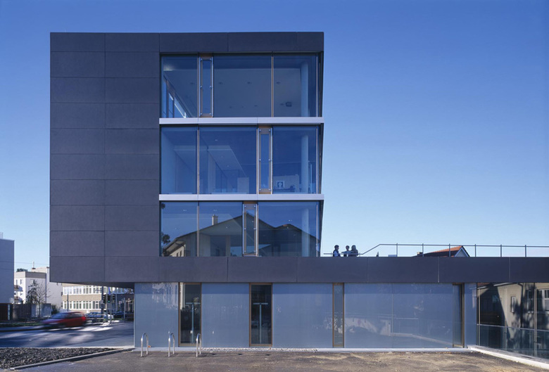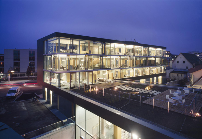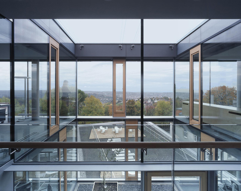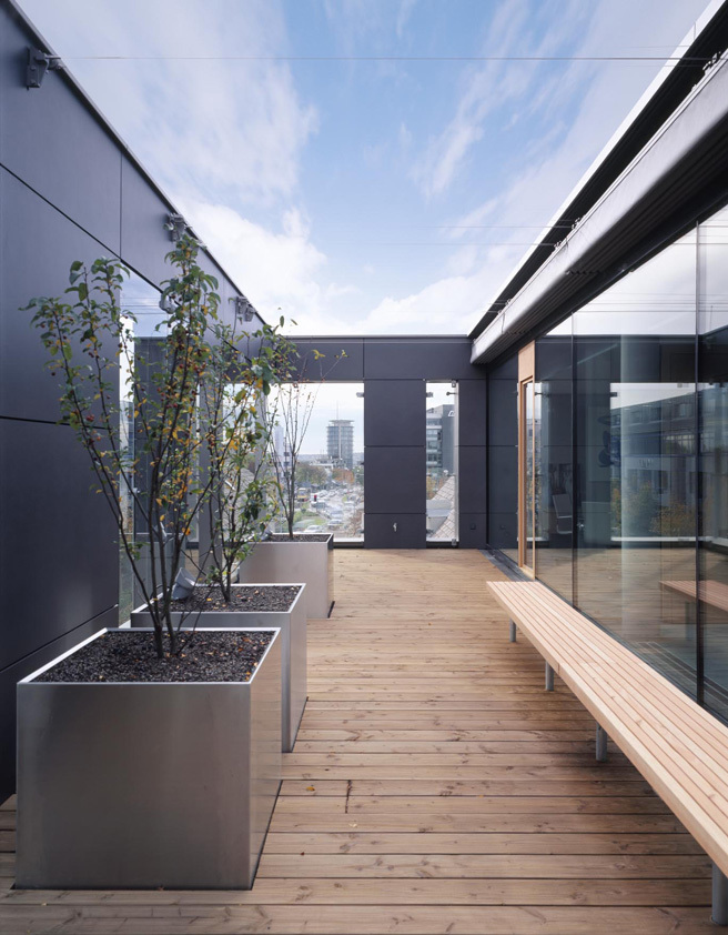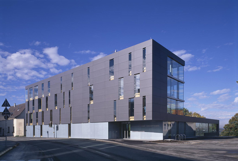 Der Neubau der Bezirksärztekammer Nordwürttemberg in Stuttgart-Degerloch bietet Mitarbeitern und Mitgliedern der Berufsvertretungsorganisation den maßgeschneiderten, idealen Rahmen für Verwaltungsarbeit, Fortbildung und Berufspolitik. Die Aufgaben der Ärztekammer lassen sich an der Struktur des Raumprogramms mit Einzelbüros, Kombibüros, Besprechungszonen, Schulungsräumen und Saal ablesen. Das Grundstück befindet sich an der Hangkante des Stuttgarter Talkessels und ist in seiner Orientierung und Exponierung gleichermaßen belastet wie privilegiert: Die beiden umschließenden Straßen zur Filderfläche und in den Stuttgarter Talkessel sind von extrem hohen Fahrzeugfrequenzen belastet, doch der Ausblick von den oberen Geschossen des Gebäudes entschädigt für diesen Umstand: Er umschließt sowohl die Stuttgarter Innenstadt mit ihren Randbezirken, wie auch die Kulisse der Schwäbischen Alb im Süden. Struktur und Orientierung des Gebäudes werden von dieser ambivalenten Ausprägung des Ortes bestimmt. Der skulpturale Baukörper passt sich perfekt in die komplexe Geometrie und Schnittfigur des Grundstücks ein. Zur südlichen Jahnstraße hin zeigt sich das Gebäude mit einem hohen Anteil an geschlossenen Flächen und definiert so eine eindeutige Abgrenzung zum öffentlichen Raum. In mehreren terrassierten Stufen bietet die mäandrierte Gebäude-Skulptur einen weiten Ausblick auf den Stuttgarter Talkessel im Norden. Der Gegensatz zwischen geschlossener Loch-/Schlitzfassade und der optimiert transparenten Fassade werden vom Betrachter in seiner Bewegung um den Gebäudekomplex wahrgenommen. Die Südfassade wird durch ein alternierendes Spiel von Öffnungen und geschlossenen Flächen belebt. Die unregelmäßige Anordnung der Flächenkomposition bietet dem sich nähernden Betrachter ein interessantes Spiel perspektivischen Erlebens, das sich aus unterschiedlichen Blickwinkeln ergibt. Die Südfassade zeigt durch ihre Schichtung besondere räumliche Tiefe. Sie ist mit einer Vorhandfassade aus Faserzementelementen versehen, den tiefer liegenden Holzfenstern sind schalldämmende Einscheibenverglasungen flächenbündig mit den Tafeln vorgesetzt. Die Transparenz der Nordfassade hingegen entsteht durch geschosshohe, feststehende Verglasungen. Auch hier wird die natürliche Lüftung durch in die Fassade eingesetzte Holzfenster mit vorgesetzter Einscheibenverglasung gewährleistet. Das Technikkonzept des Gebäudes umschreibt einen Kanon zeitgemäßer energieeffizienter Komponenten: Bauteilaktivierung in den Büros, Kühldecken in den Sitzungsräumen, Erdsonden mit Wärmetauscher, natürliche Be- und Entlüftung und die Minimierung des sommerlichen Wärmeeintrags sind nur einige Merkmale des optimierten, „sanften Energiekonzeptes“ des Neubaus. Die Materialität des Bauwerks beschränkt sich auf das reduzierte Spektrum natürlicher Baustoffe. Sichtbeton, Faserzement, Holz, Glas und Naturstein bestimmen in ihrer Einfachheit und klaren Fügung das Bild. Das Bauwerk übersetzt durch sein Spiel mit Offenem und Verborgenem, durch Transparenz und Transluzenz und durch seine begreifbare Materialität das Selbstverständnis einer sich öffnenden, kommunikativen Berufs- und Standesorganisation.