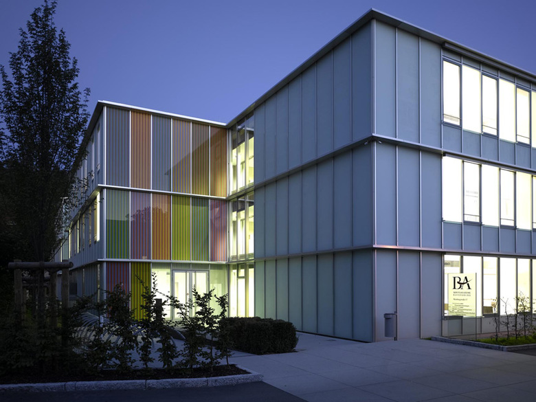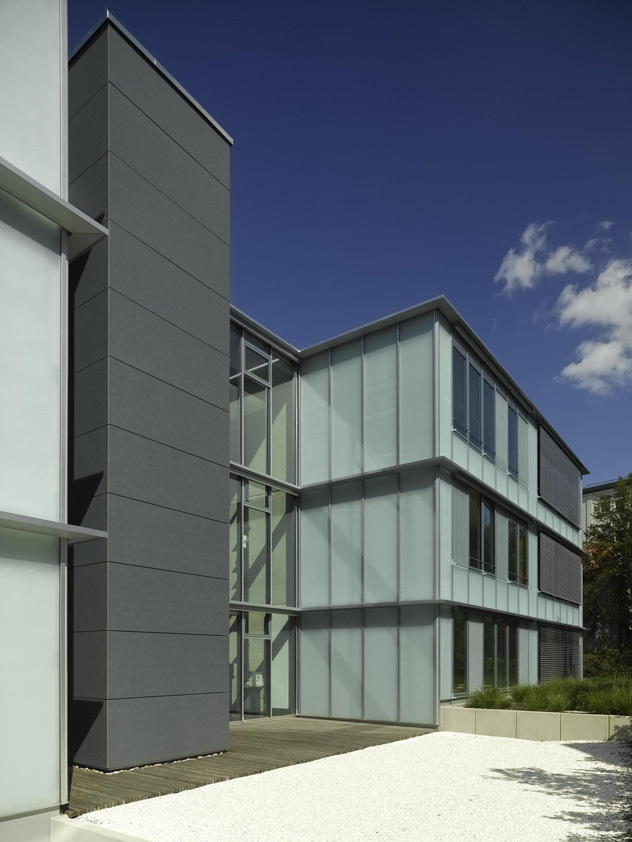 Die Baukonstruktion der neuen Berufsakademie ist wirtschaftlich ausgelegt: Stahlbetonkonstruktionen und eine vorgehängte, wartungsarme Aluminium-Glas-Fassade bestimmen das Bild. Die Fassade selbst ist in ihrer Vielschichtigkeit und Wirkung der Glasarten, ihrer Belichtung und Beleuchtung ein Zeichen der inneren Aktivität der Berufsakademie nach außen.