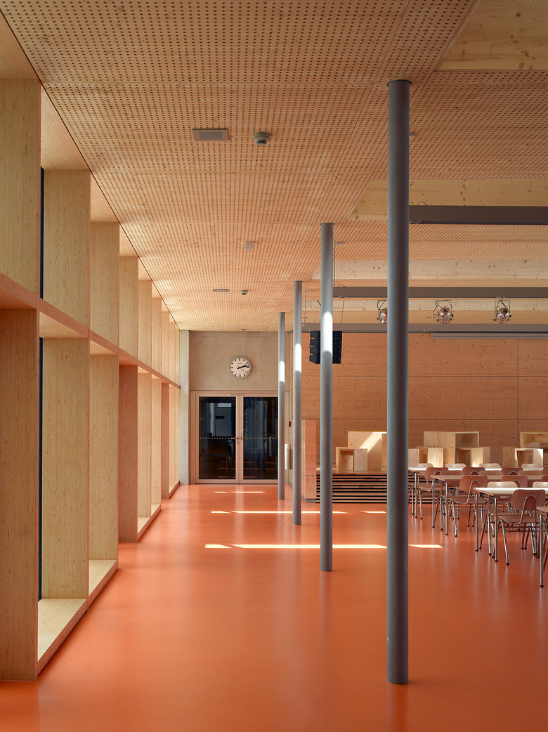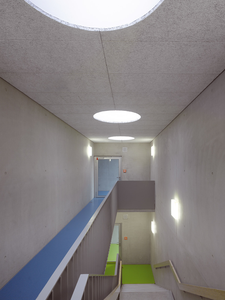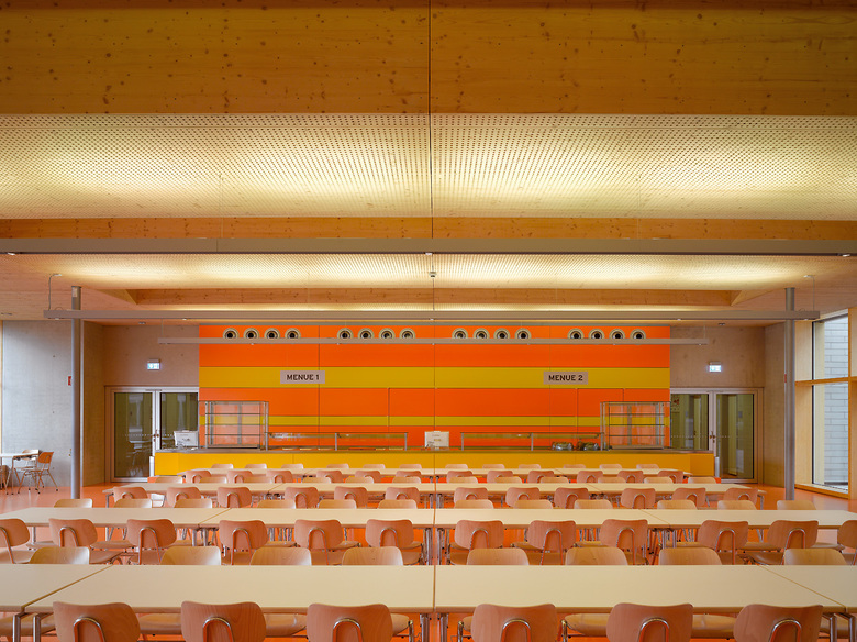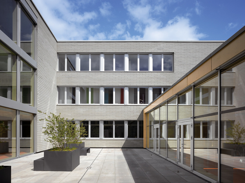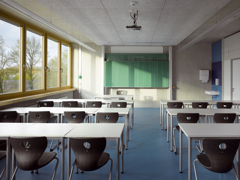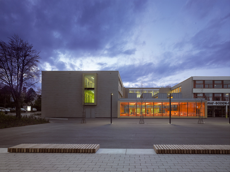 Die Bestandsgebäude der Graf Soden Realschule sind typisch für die Architektur der 1970er Jahre in Deutschland. Die Atrium-Typologie in Verbindung mit einer Stahlbeton-Fertigteil-Konstruktion sprechen eine klare aber auch raue architektonische Sprache. Die Klarheit und Logik der Grundrisse wird aus dem heutigen Empfinden durch den nüchternen architektonischen Ausdruck konterkariert. Die Erweiterung des Gebäudekomplexes nimmt die positiven Strukturen einer klaren Grundrissfügung auf und entwickelt um einen Innenhof ein Ensemble von Klassenräumen und Mensa. Hierbei werden horizontale und vertikale Erschließungsstrukturen fortgeführt und Altbau und Neubau in ein Gesamtsystem überführt. Der architektonische Ausdruck ist unserer Zeit verpflichtet, ein Spiel von geschlossenen Kuben und filigranen Fassaden versuchen, das Interesse des Betrachters zu wecken. Besondere Sorgfalt gilt der Material- und Farbwahl: Natürliche Materialien wie Sichtbeton, Holz und Glas werden durch ein vitales Farbkonzept ergänzt. Die Grundfarben der Graf Soden Realschule, ein Logo und der Farbentwurf aus den 1970er Jahren sind Leitbild für die Differenzierung der Schulgeschosse. Von besonderer Bedeutung ist der Entwurf der Mensa als öffentlicher Raum. Hier leistet eine weitgespannte Holzkonstruktion stützenfreie Flexibilität im Raum und Belichtung über die Dachfläche gleichermaßen.