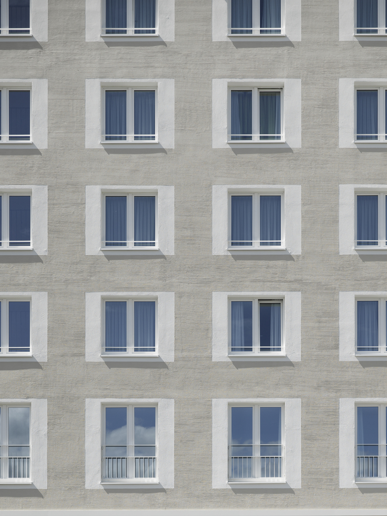 Die Lochfassade bildet die innere Hotelorganisation mit ihren 126 Zimmern nach außen ab. Sie wurde mit einer WDV-Fassade versehen und mineralisch verputzt. Mit Sockel, Etagen und Dachgeschoss zeigt sie eine klassische Gliederung, traditionelle Putztechniken geben der Fläche Qualität. So wurde das Erdgeschoss mit einem dunkelgrauen Kammzug versehen, dessen Licht- und Schattenspiel die Fläche belebt. Abgesetzt durch ein Gesims erhielten die darüber liegenden Etagen eine feinere Putzstruktur in einem hellen Farbton, der an den Sandsteinton des Klinkers des Vorgängerentwurfs erinnert. Faschen in weißer glatter Putzstruktur vergrößern optisch die Fensteröffnungen und geben ihnen eine prägnante Gestalt. Die Sonnenschutzverglasung macht außenliegende Stores überflüssig, sodass nichts die äußere Ruhe und Gleichmäßigkeit der Fassade stört.