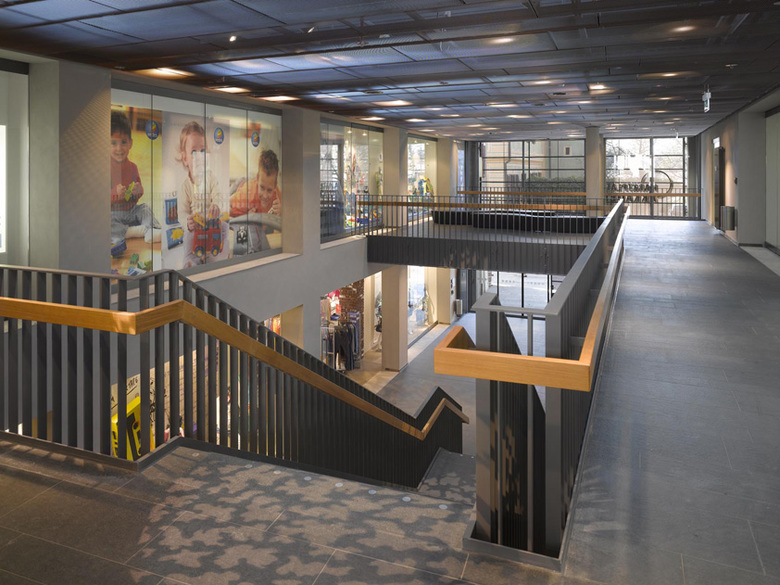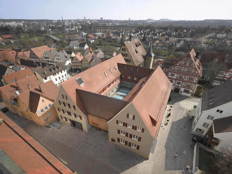 Der bisher offene Innenhof wurde überdacht und in eine zweigeschossige, großzügige Erschließungshalle umgewandelt, die als öffentliche Passage die untere Marktplatzebene mit dem höher liegenden Kirchplatz verbindet. Die neu erstellten Verkaufsflächen bieten durch flexible Glastrennwände die Möglichkeit sich zur Halle hin großzügig zu öffnen. Durch neu in die Arkadenbögen eingesetzte Verglasungen entsteht im Erdgeschoss zusätzlicher Innenraum und einladende, großzügige Schaufensterflächen.