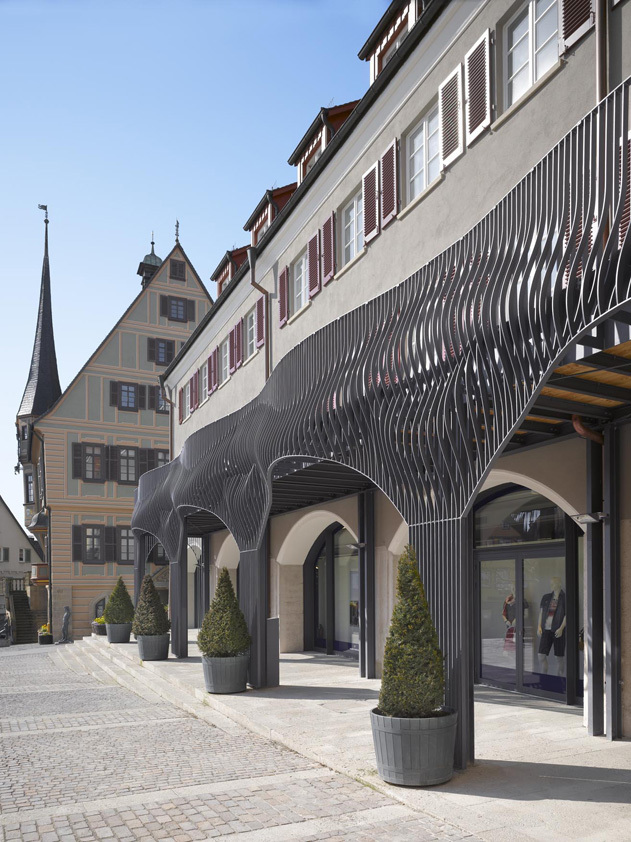 Auf der Marktplatzseite wurde eine Stadtloggia aus geschwungenen Stahlstäben ergänzt. Die Geländerkonstruktion nimmt die Form der Arkadenbögen auf und erzeugt unterschiedliche Aufenthaltsqualitäten im öffentlichen Raum, die bei zahlreichen öffentlichen Veranstaltungen auf dem Bietigheimer Marktplatz bespielt werden. Der zurückgesetzte Stahlbau des neuen Quergiebels erhält eine homogene Kupferverkleidung, die den neuen Baukörper sichtbar gegen den Bestand absetzt und gleichzeitig den neuen Zugang markiert. Die Kupferverkleidung wird in der Halle in Form einer aufgelösten Streckmetalldecke fortgesetzt. Im Süden wird die Kupferstruktur in Form einer großen Toranlage am neuen Haupteingang an der Hauptstraße abgeschlossen.