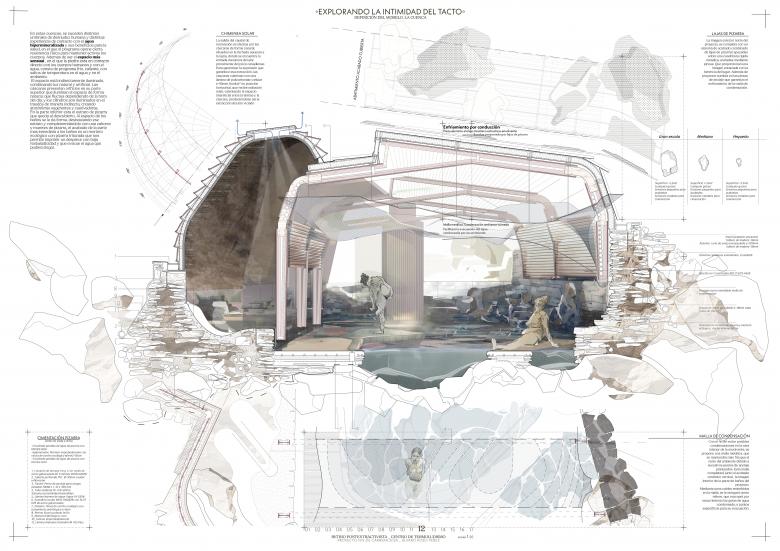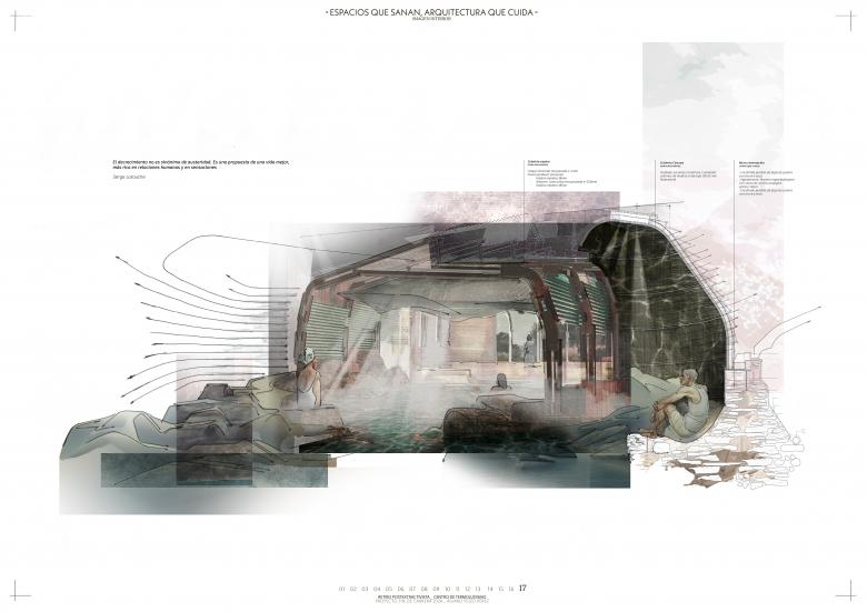 The current consumption model is outdated, and architecture reflects this crisis. This project, driven by degrowth principles, reimagines construction practices to foster healthier, regenerative spaces. Through the case study of a thermal leisure center in an abandoned slate quarry in Sierra de la Culebra, a prototype of degrowth strategy for architecture is developed. After a devastating wildfire in 2022 ravaged the region’s biodiversity, deep-rooted issues were laid bare: depopulation, climate change, and an outdated economic model driven by uncontrolled resource extraction.
