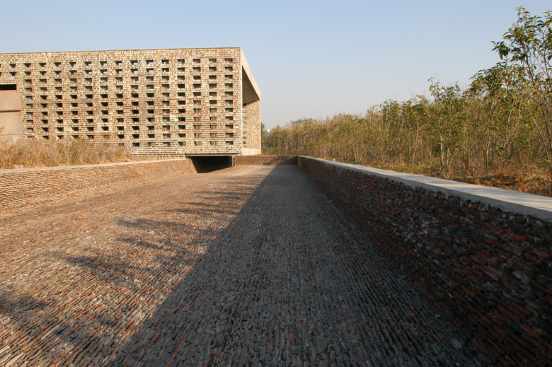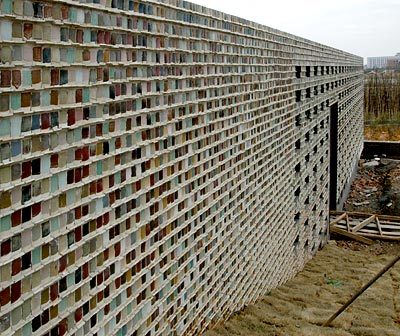 The shape of the café-house is similar to the ink stone—a one-storey house, the front faces the south and the back faces the north. Drinking coffee inside is just like sitting at the bottom of the ink stone. The wind is coming from the southeast and crawls up along the slope to the northwest. Jinhua is a city with a lot of rain. The rain drips from the northwest to the southeast. Several trees are planted on the top of the ink stone slope. Sitting indoors, the view moves upward along the slope and then disappears in infinity. The west and east walls are full of little holes. On one hand it is for the wind and light, and emphasizes the direction of the house. By the west door, there is a stair leading to the roof. The view to the river is great from there. Colorful pieces of porcelain made by Zhou Wu are pasted on the inner and outer walls of the house. In this way, the house is colored. The pieces are arranged irregularly, however they present all colors in Chinese ceramic.