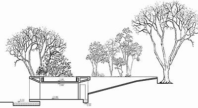 There are two doors for the house; one is on the east and the other on the west. I planned the path just through the building. On the north of the house lays a tree-meter high earth bank running from east to west. The house is anchored on the earth bank. At the same time the earth bank prevents the hustles and bustles from the road on the north. The shallow pool in the south catches the inverted reflection of the house in the water.