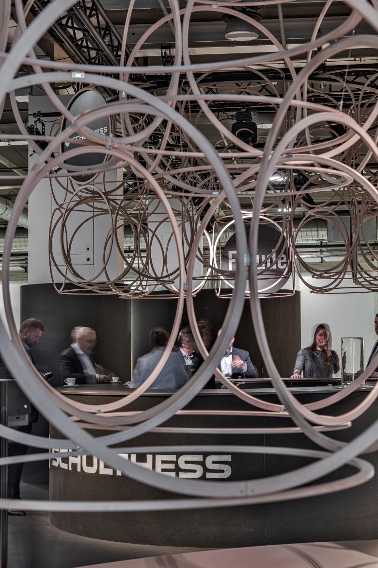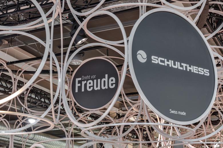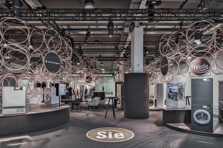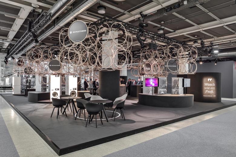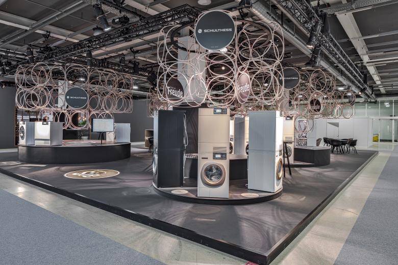 An der grössten Fachmesse der Bau- und Immobilienwirtschaft der Schweiz, der Swissbau in Basel, ist der Waschpionier Schulthess mit einem besonders runden Konzept aufgefallen. Die Idee «Dreht vor Freude» wurde hierbei zum Dreh- und Angelpunkt der Installation: Der Stand überraschte mit aufgehängten Hula-Hoop-Reifen, welche die Drehungen für die Besucher visuell erlebbar machten. Unterstützt wurde die Szenografie durch eine Lichtinstallation, welche zusätzlich die Schatten der imposanten Holzring-Installation zum Drehen brachte. Die Maschinen wurden auf voluminösen runden Podesten präsentiert, umrahmt von einer reduzierten Linienführung. Entstanden ist eine durchweg stilvolle und hochwertige Wohlfühlumgebung, die sowohl der Marke Schulthess wie auch ihren erstklassigen Produkten stimmig Rechnung trägt.