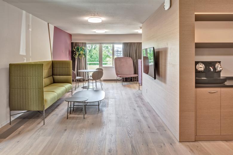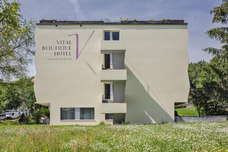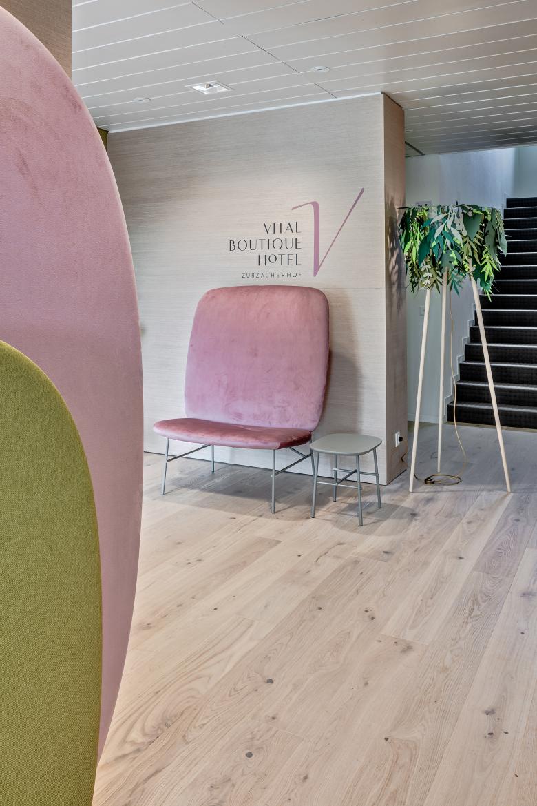 Revitalisiertes Hotel für revitalisierte Gäste. Damit das Vital Boutique Hotel Zurzacherhof Körper und Geist seiner Gäste fit machen kann, brauchte es zunächst selbst eine komplette Revitalisierung. Dieser innenarchitektonischen Kur nahmen wir uns an und entwickelten ein neues Interior-Design-Konzept. Oberflächen, Mobiliar und Beleuchtung, in natürlicher Form- und Farbgebung eingesetzt, spielen harmonisch zusammen und auch dank der Auffrischung des Stil-Mixes aus klassischer Kur-Architektur und 60er Jahre-Minimalismus entstand so ein einladendes Corporate Interior. Über dem Gesamtkonzept lag der Gedanke, Wohlbefinden durch schlichte Einfachheit zu erzeugen, indem die Liniensprache aus der Architektur aufgenommen und subtil in den Innenbereich abgeleitet wurde. Der neu strukturierte und versinnbildlichte, warm gestaltete Raum-Freiraum hebt den Ausdruck und vermag jeden Gast, emotional an das Kurhotel zu binden.
