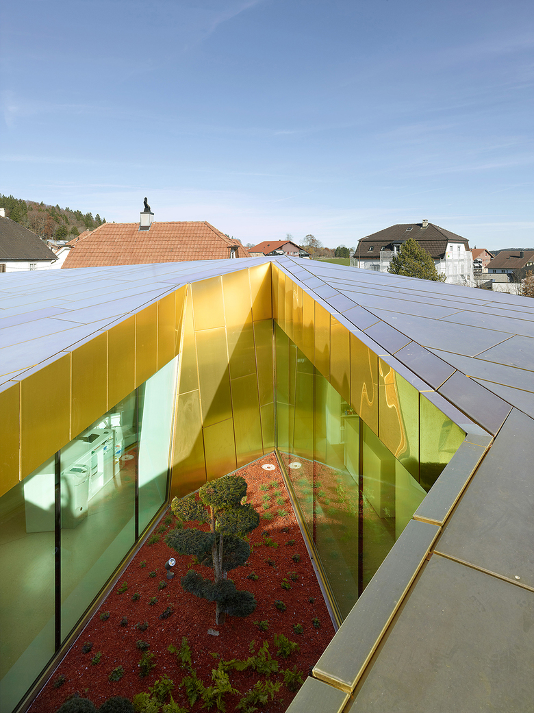 La couleur mate de teinte bronze reprend la tonalité de couleurs de la nature environnante. La façade reçoit une profondeur supplémentaire par le motif des trous et la couleur aubergine en arrière-plan apporté par l›étanchéité.