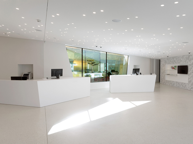 La matérialisation intérieure est prévue dans les tonalités blanches compléter de quelques touches de couleurs. L’ambiance est modern, accueillante, convivial, de confiance, représentant la philosophie de la banque Raiffeisen.