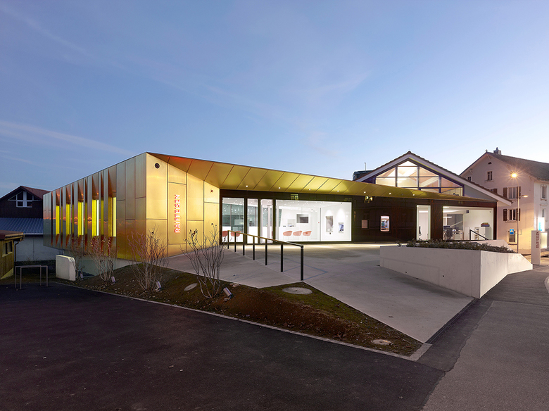 Le client est accueilli par l’avant toit de l’extension et amené à travers la zone 24h dans l’espace clientèle. L’organisation de plan se base sur un concept ouvert.