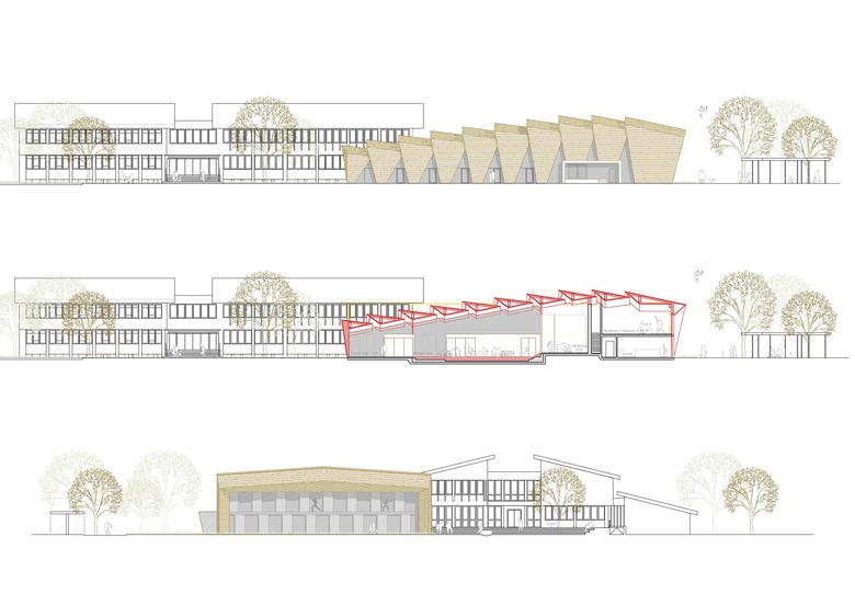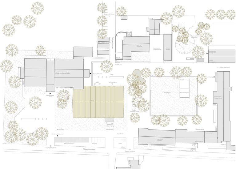 Das Projekt vereinigt die geforderten Nutzungen unter einer Hülle und schafft damit ein neues klares Volumen und Identität. Die Strukturierung und Gestaltung der Fassade leitet sich aus den unterschiedlichen Anforderungen der Aula ab. Der gestaffelte Längsschnitt wird hergeleitet aus der optimalen Belichtung und eines raumakustisch guten Volumens. Das Trägerquerprofil bildet die Statik und integriert die Leitungsführung der Haustechnik.
