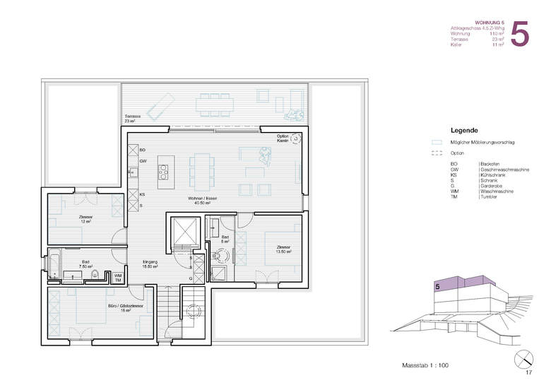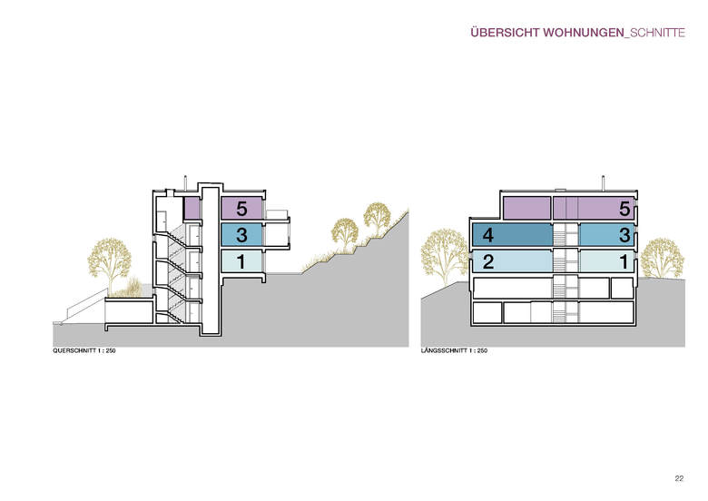 Wohnen im Grünen, stellt den Grundgedanken des architektonischen Konzeptes des Mehrfamilienhauses dar. Volumetrisch wird die Liegenschaft als eine Einheit gelesen. Dank der Hanglage bieten sich die Technikräume und Parkplätze im Sockelgeschoss an. Die fünf Wohnungen werden durch ein zentrales Treppenhaus mit Lift erschlossen. Jedes Geschoss weist seine eigenen Aussenraumqualitäten auf. Die Wohnungen im Erdgeschoss verfügen über einen grosszügigen, geschützten Garten mit einer intimen Atmosphäre. Die Wohnungen im Obergeschoss profitieren von grossen Balkonen. Die Attikawohnung, bietet einen wunderschönen Ausblick von der grosszügigen Terrasse und wird direkt durch den Aufzug erschlossen.