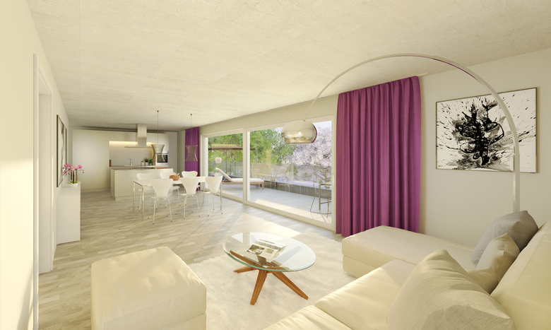 Die Grundrisse sind einfach und rationell gegliedert. Sie profitieren von optimaler Flächenausnützung und Lichtverhältnissen. Die Wohnräume sind gegen Süden orientiert, die Schlafräume gegen Norden. Die grösseren Wohnungen verfügen über zwei Nasszellen Dusche/Bad, die kleineren über ein Badezimmer. Die modernen Küchen sind offen gestaltet, mit einer Kochinsel, und mit hochwertigen Küchenapparaten ausgestattet. Die Materialisierung ist modern, schlicht und entspricht dem heutigen Eigentumswohnungsstandard. Die Wohnungen verfügen über eigene integrierte Waschmaschinen und Trockner.