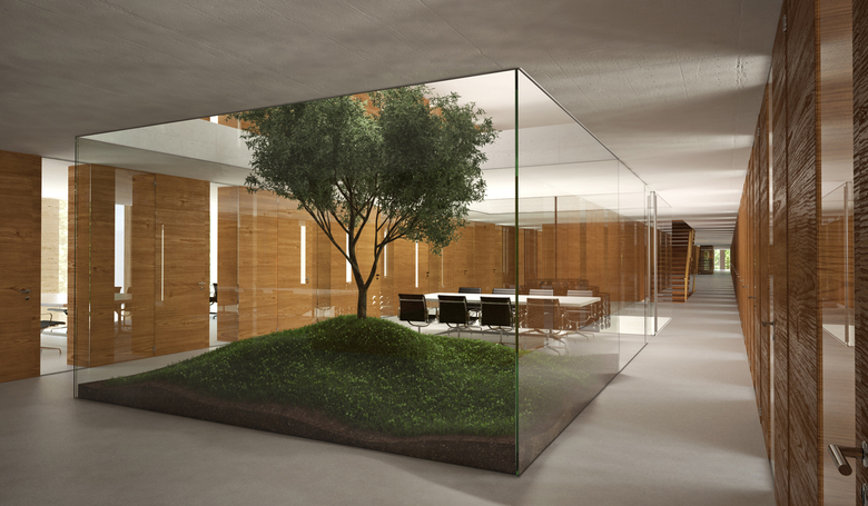 Drei offene mit Eiche verkleidete Treppentürme führen in die Obergeschosse. Die Korridore werden mit Holz ausgekleidet, im Kontrast zu den Büroräumen und dem Erdgeschoss. Verbindende Innenhöfe erlauben den Dialog unter den Geschossen und erzeugen differenzierte, unterschiedliche Innenwelten und Sichtbezüge. Sie sind Aussenraum, bieten Platz für Skulpturen und Beleuchtungen oder dienen einfach als grosszügige Sitzungsräume.