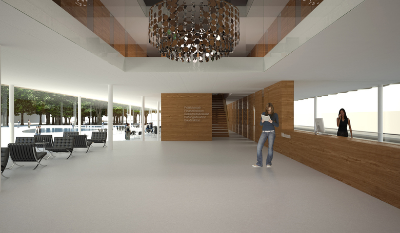Auf der Ebene Erdgeschoss nimmt das Stadthaus den Dialog mit seiner Umgebung auf und erzielt in den Obergeschossen über die neutrale Fassade die Wirkung des Solitärs. Die Cafeteria bildet das Bindeglied zwischen Verwaltung, Stadtratsaal