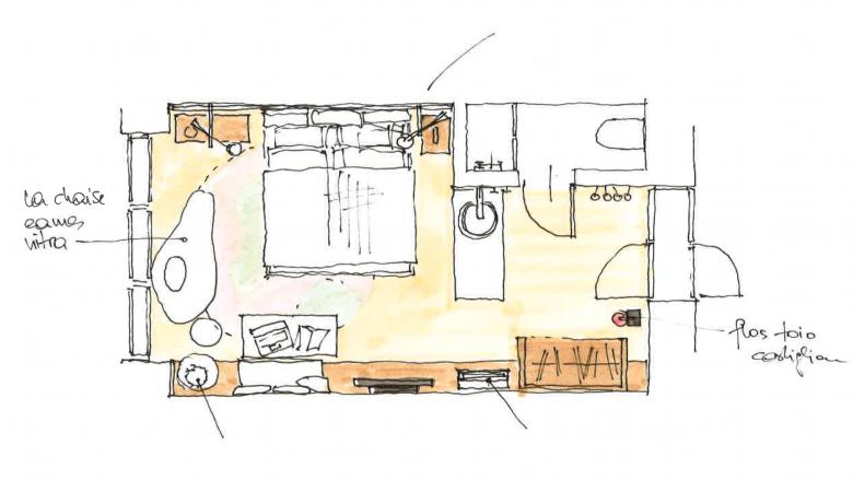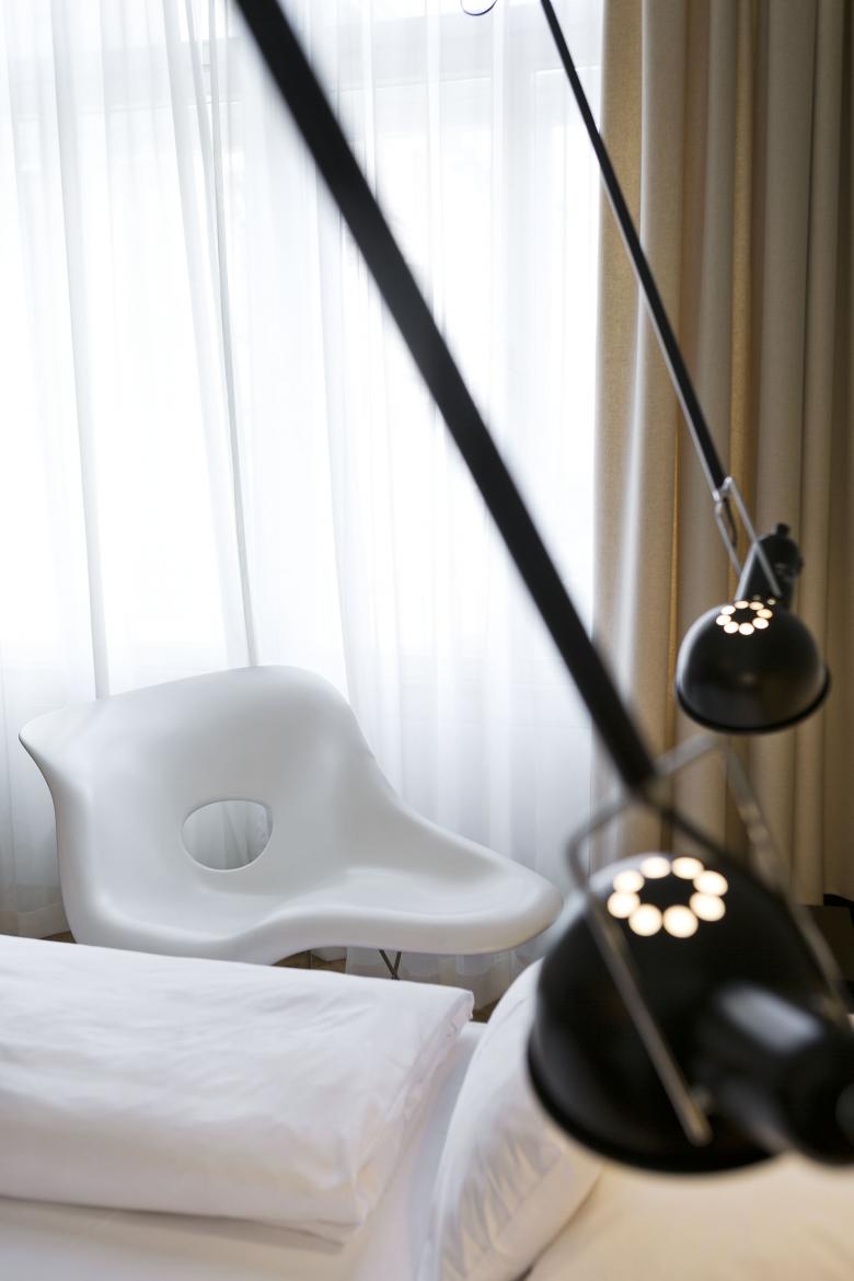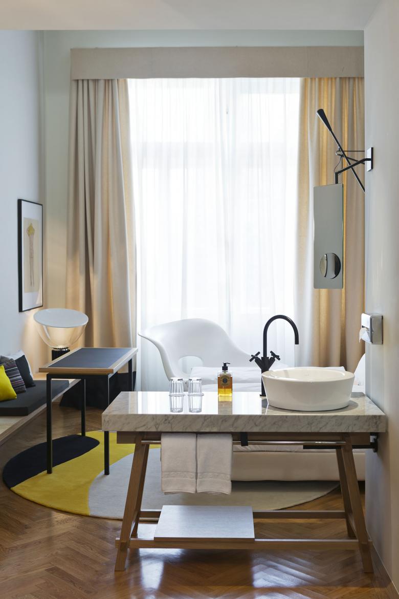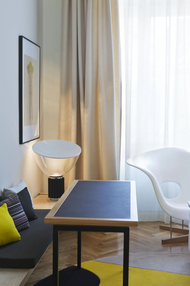 Whether designed by an international architect such as Matteo Thun or a contemporary fashion icon of the caliber of Lena Hoschek—no two rooms in the Hotel Altstadt Vienna are identical. However, they all have one thing in common: Vienna’s well-known and widely praised comfort and atmosphere. Part of the goal of Archisphere’s design was to complement the colorful spectrum to be found here with an additional room that’s not just a place to sleep—one could call it an idea workshop, a place of inspiration and a gallery of possibilities. The center of the space, which stimulates creative thinking, is an ample, luxurious bed that, together with the striking furnishings and accessories, creates a charming ensemble. Curtains, furniture—table, bed and washtable—and the gray, black and yellow rug were designed by Archisphere especially for this room. Nestled in a multifaceted whole, the latter reflects the shades employed in the interior. The wall-mounted mirror was inspired by a truck’s sideview mirror. La Chaise by Eames presides near the window, inviting guests to relax. Placed across from the bed, a freestanding washtable resembling a workbench was created especially for this space. Luxurious materials—marble, solid wood and leather—create a lively contrast to the classic form of the atelier workbench. Iconic lamps by Achille Castiglione and the sconces by Paolo Rizzatto, perfect for reading, provide illumination. Complemented by contemporary artworks from the extensive collection of host Otto Ernst Wiesenthal, the atelier appearance creates a free zone that does much more than satisfy expectations.