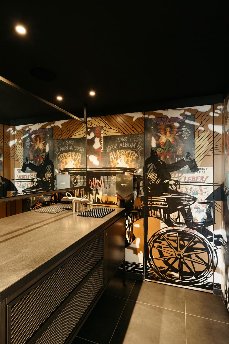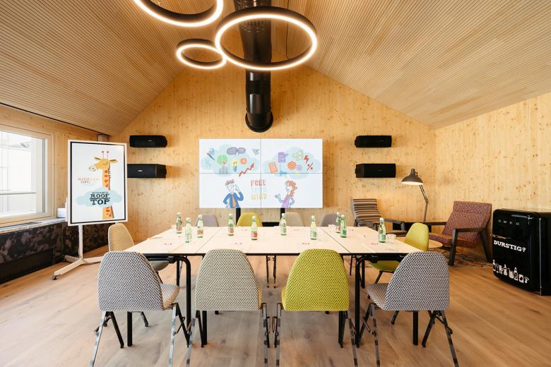 All the technical requirements that the digital society demands for events have been skillfully integrated into the room concept without coming to the fore. Flexibility was also taken into account. For example, two meeting rooms can be turned into one large one. The playfulness is not neglected either: This can be experienced in the sanitary area where the wall painting is backed with fluorescent colors and only becomes visible through black light. A surprise when the conventional light source is switched off.