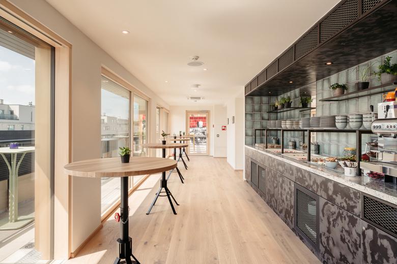 On the terrace with its leafy pergola, nature is the designer: a breathtaking view over the Vienna Arsenal and the Sonnwendviertel enchants guests here.
