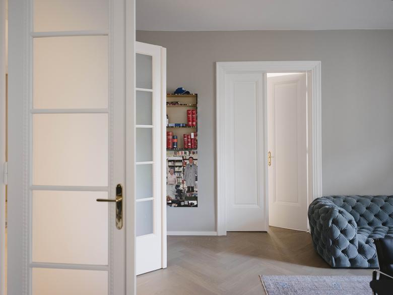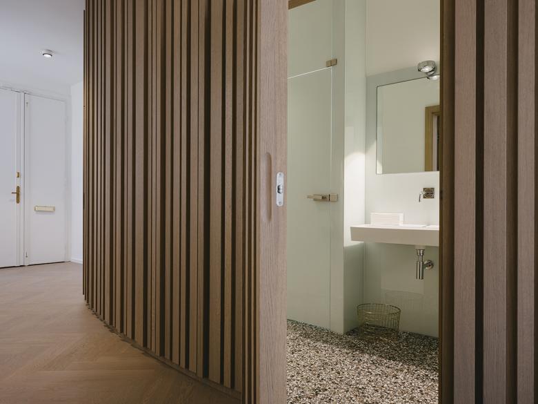 Even the unusual sculptural wall in the entrance area provides a simple introduction to the historical structure with its high ceilings, but at the same time it conveys a stylish distinction. Visitors are gently guided into the office along a slight curve. The necessary wet rooms, which are accessed through a wallpaper door, are cleverly concealed behind it.