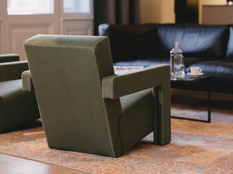 Each of the spacious offices that connect here is individually designed. Thus, the personal characters of the customers have been meticulously catered for. There is a cozy Chesterfield sofa and art that makes you smile, and guitars and a high-end hi-fi system for music enjoyment. This project was also about creating space for some pieces from the partners' extensive art collection. In this way, the works complete the high quality of stay and provide free space for thinking. Everything is embedded in a color play with contrasts: the warm gray walls together with the dark gray curtains meet white ceilings and historic box windows, and together with design classics this composition results in a professional and at the same time pleasant working environment.