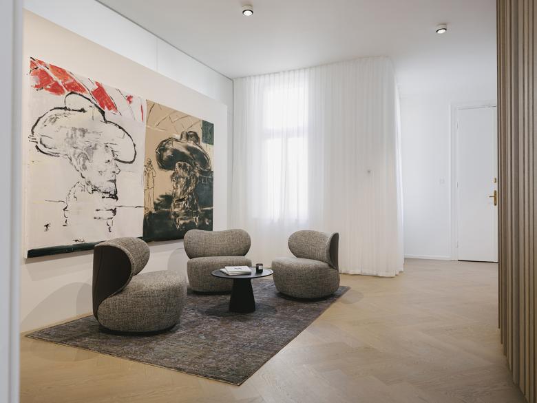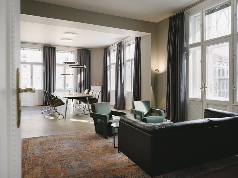 The fully refurbished office in Vienna's 7th district can be described as the opposite of a generic office. An unrenovated old building was transformed into a unique space for successful, individualistic lawyers and real estate developers. What sets this space apart are not just the elegant features of a professional office, but the personalized feel-good elements used to generate pleasure. In addition to usability, seriosity and design, art and music also play a central role. Professionalism and passion are combined here.
