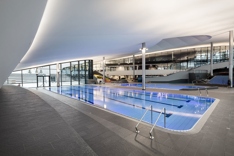 Im Osten entwickelt sich die eigentliche Wasser- und Freizeitlandschaft des Bades: ein großer, offener Raum erstreckt sich über zwei Niveaus und ist lediglich durch transparente Fassaden unterteilt. Alle Aktivitäten und Attraktionen sind somit überschaubar, alle wichtigen Funktionen und Ausblicke visuell und räumlich vernetzt: Familienspaß im unteren Bereich, Wellness im oberen mit Blick über den Spaßbereich und auf das grandiose Bergpanorama des Mont-Blanc-Massivs.