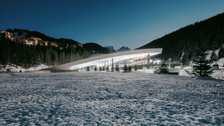 Der großzügig auskragende Dachschirm als östlicher Abschluss der Landschaftsscholle formuliert gemeinsam mit dem zentralen westlichen Vorplatz den Eingang zum Bad. Durch die konkave Glasfassade gelangt der Besucher in die dreigeschossige Eingangshalle. Sie ist Orientierungs- und Knotenpunkt und steht dank der transparenten Fassaden sowohl mit dem Außenbereich als auch mit den Schwimmbecken in Sichtbeziehung. Von hier aus erschließen sich der untere Empfangsbereich und die Umkleideräume des Bades sowie nördlich der Halle der über mehrere Ebenen organisierte Restaurantbereich. Von der oberen Etage des Restaurants blickt man sowohl auf die tiefer gelegene Badezone als auch auf das Bergpanorama im Norden.