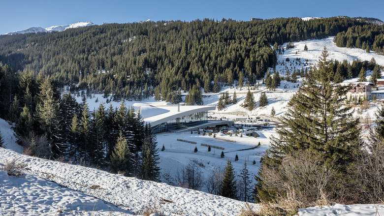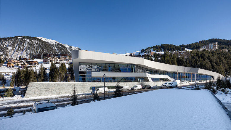 Courchevel, ein mondäner Skiort in der „Haute Savoie“, ist Teil der „Trois Vallées“, einem der größten zusammenhängenden Skigebiete der Welt. Das Erlebnisbad befindet sich in einer Talsenke zwischen den Bergstationen Courchevel 1550 und Courchevel 1650, von wo aus sich spektakuläre Panoramen auf die umgebende Bergwelt eröffnen: im Süden die Hochgebirgskulisse, im Norden eine weiche Berglandschaft mit verstreuten Almhütten und dem dahinterliegenden Mont-Blanc-Massiv. Das Bad ist von fast allen umgebenden Berghängen und Bergstationen aus gut sichtbar.