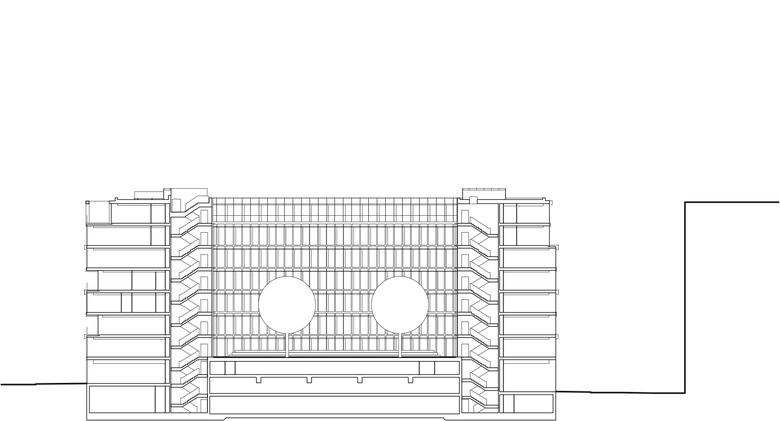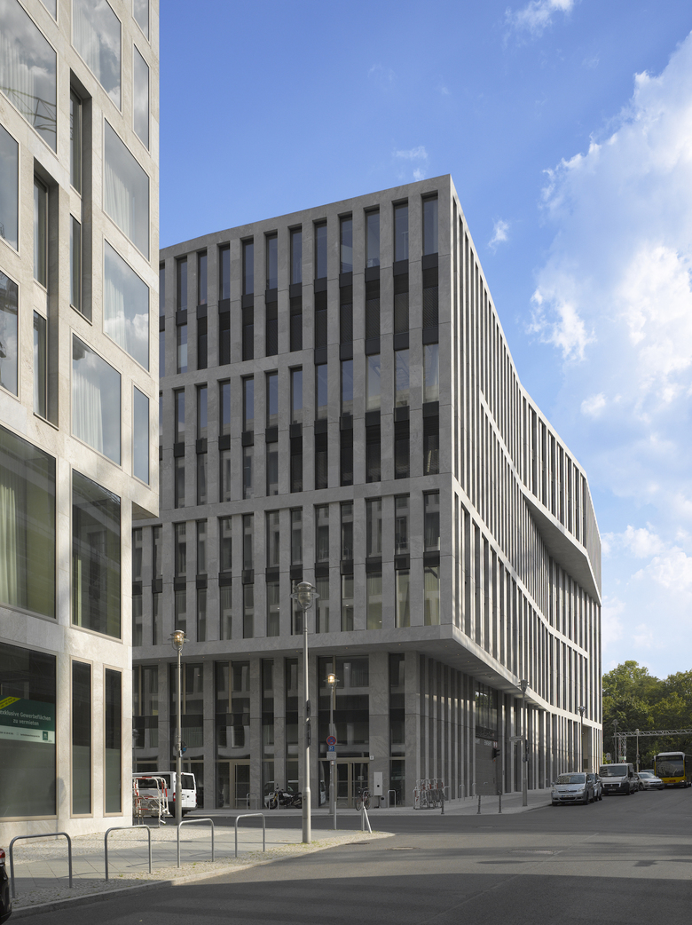Das Bürogebäude in unmittelbarer Nähe zu Hauptbahnhof und Regierungsviertel bildet einen der vier Stadtbausteine des Lehrter Stadtquartiers. Fassadenflächen aus hellem Naturstein im Wechsel mit dahinter zurücktretenden Glasflächen definieren die äußere Schale, während sich die Gebäudeinnenseiten mit vollflächigen Glasfassaden zum begrünten Innenhof öffnen. Um die Höhe des Gebäudes zu gliedern, werden über die Fensterformate formal je zwei Geschosse zusammengefasst, die mittels leichter Geschossversprünge in Dialog mit den anderen Stadtbausteinen mit gleichen Gestaltungsregeln treten.