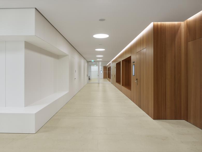 Die beiden obersten Geschosse beherbergen vor allem Büros für Richter und Rechtspfleger. Ein Detail, das die Alltagstauglichkeit dieses Bereichs, aber auch das Streben nach einfachen, nachhaltigen Lösungen belegt, ist die sommerliche Nachtauskühlung mit einer eigens entwickelten Türspaltlüftung.