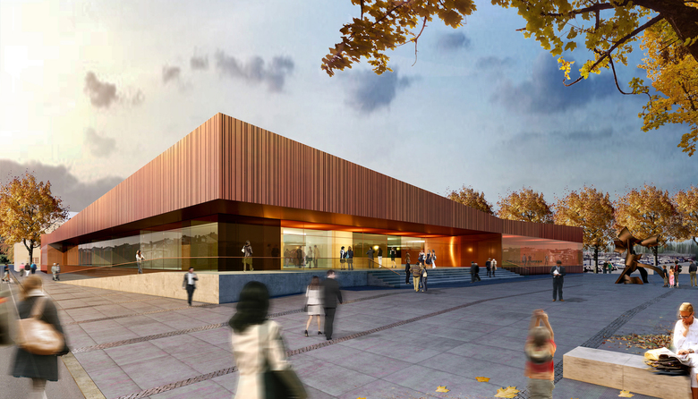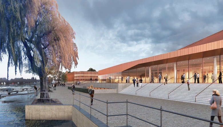 Das architektonische Konzept für die Sanierung und Erweiterung der Inselhalle sieht den Erhalt des bestehenden Saal-Nukleus und dessen Integration in die neu zu ergänzenden Nutzungen vor. Nach außen bleibt der Saal über seine prägnante Dachform klar ablesbar, wird aber mittels polygonal gefalteter Dachflächen in eine neue skulpturale Gesamtfigur eingebettet, die alle umgebenden Gebäudeteile überspannt und Neubau und Bestand als architektonische Einheit im Stadtbild präsentiert. Mit der Erweiterung erfolgt zudem eine Neuausrichtung der Inselhalle auf einen neuen Stadtplatz, dessen zweite Platzkante durch die neue Parkgarage mit integrierter Feuerwache gebildet wird.