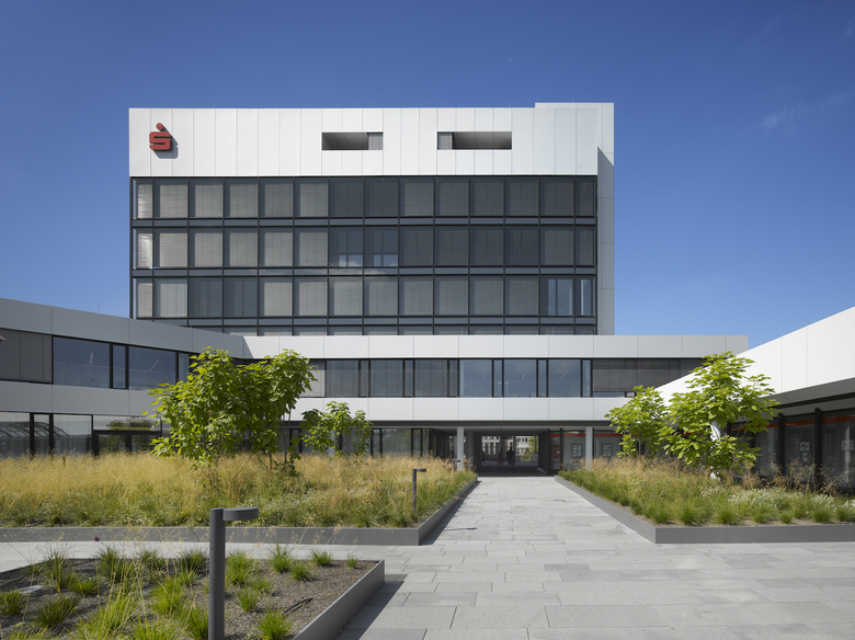 Die Kreissparkasse ordnet ihr großflächiges Areal mit Bebauung aus den 70er- bis 90er-Jahren neu. Zuerst entstehen die neuen Kundenbereiche an der Bahnhofsstraße, im zweiten Bauabschnitt werden die Bestandsgebäude einschließlich Hochhaus und Veranstaltungsforum neu strukturiert. Der Erweiterungsbau führt die Blockrandbebauung fort; seine gegliederte und profilierte Fassade steht im Kontrast zur glatten Haut des Hochhauses. Eine großzügige verglaste Halle bildet den Übergang zum Bestand. Die Verknüpfung mit der Stadt wird durch eine neu gestaltete öffentliche Durchwegung gestärkt.