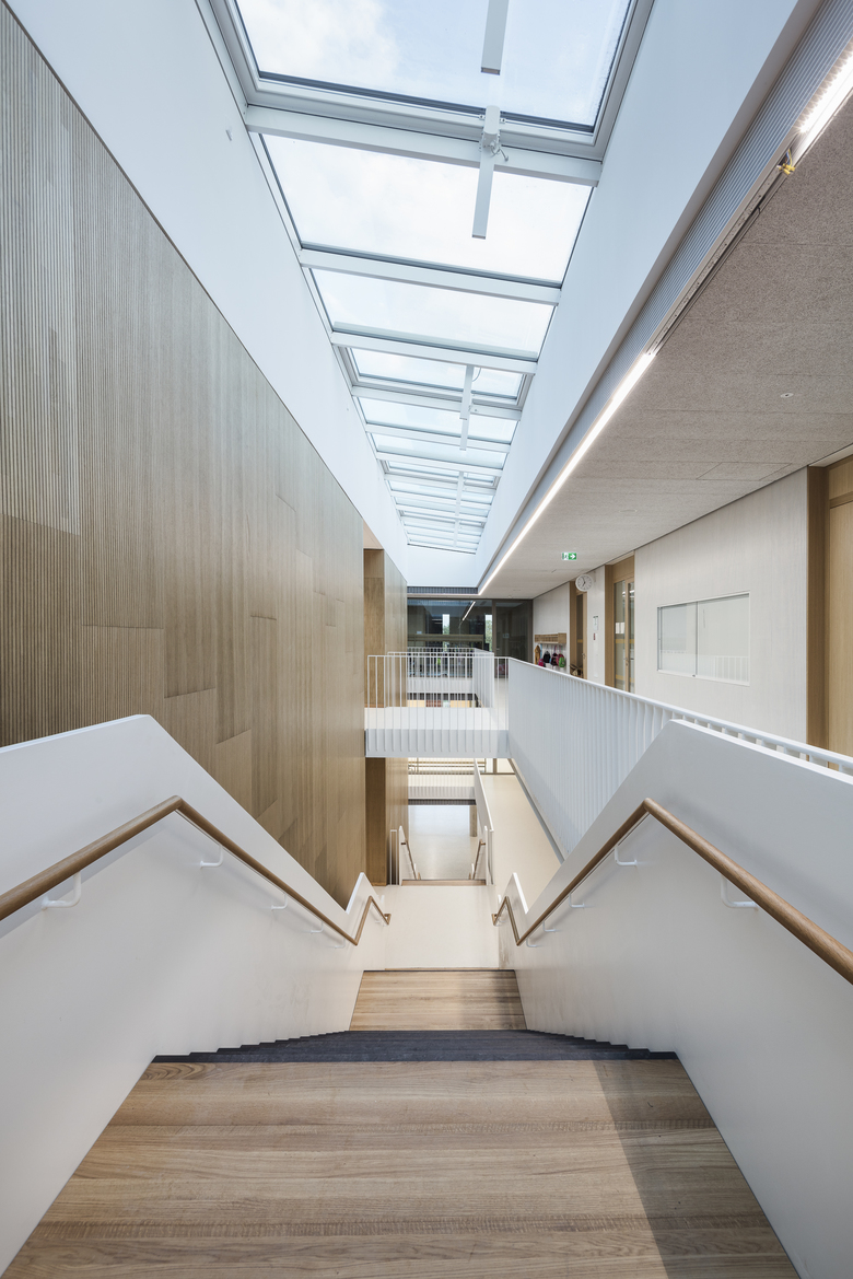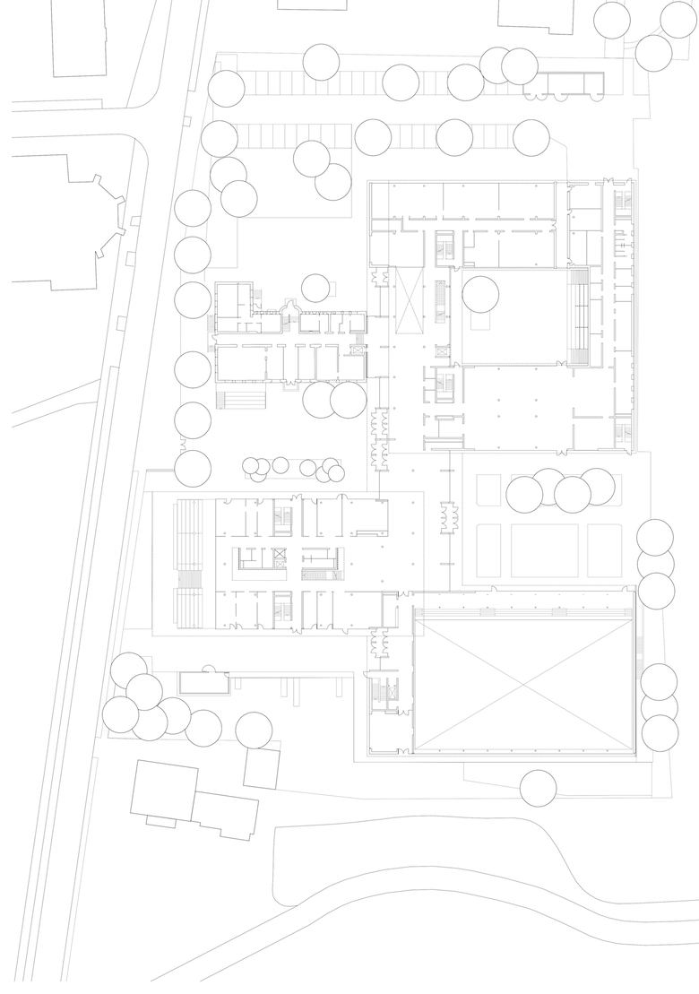 Die bestehenden Schulgebäude aus unterschiedlichen Entstehungszeiten wurden bis auf den aus dem Jahr 1912 stammenden Hauptbau gegenüber der Kirche Leiden Christi abgerissen und durch Neubauten ersetzt, die neben der Grund- und der Realschule eine Dreifachsporthalle umfassen. Verbindendes Element der neuen Schulanlage ist eine erdgeschossige Erschließungsgshalle, an die zu beiden Seiten sowohl die Schulhäuser, die Mittagsverpflegung als auch die Sporthalle anschließen. Dadurch entstehen neben einem großzügigen Eingangshof geschützte und zum Teil über zwei Ebenen reichende Pausenhöfe.