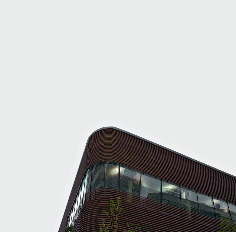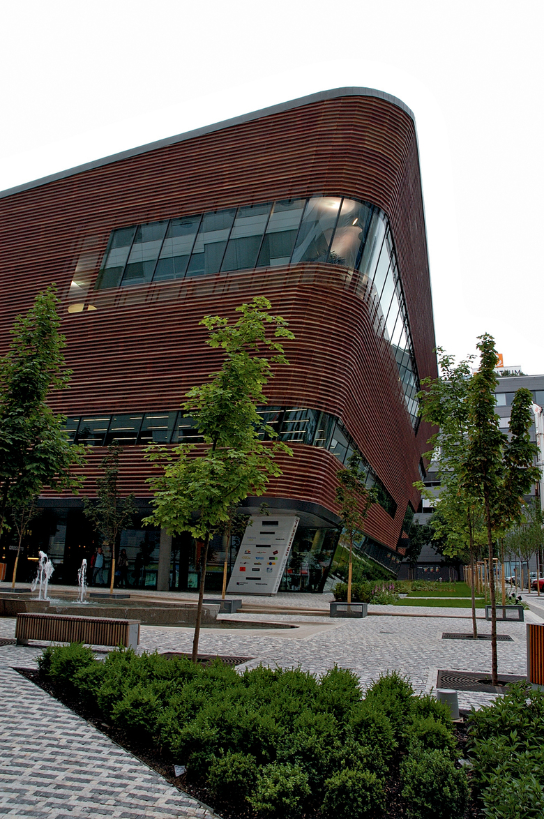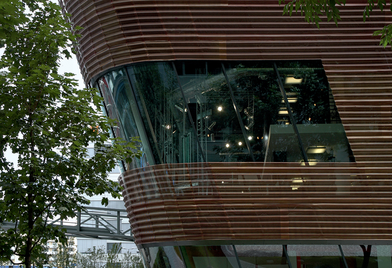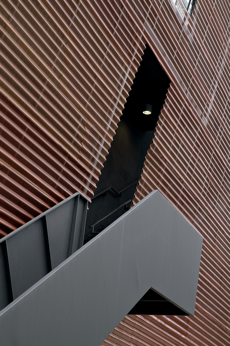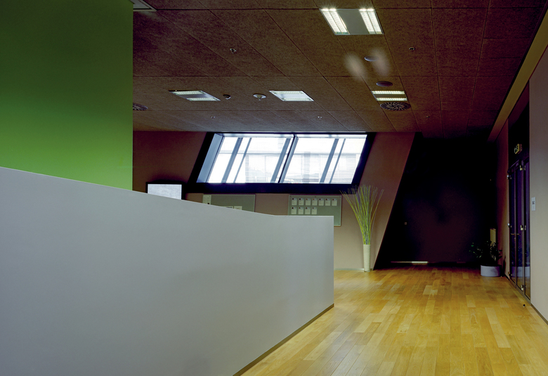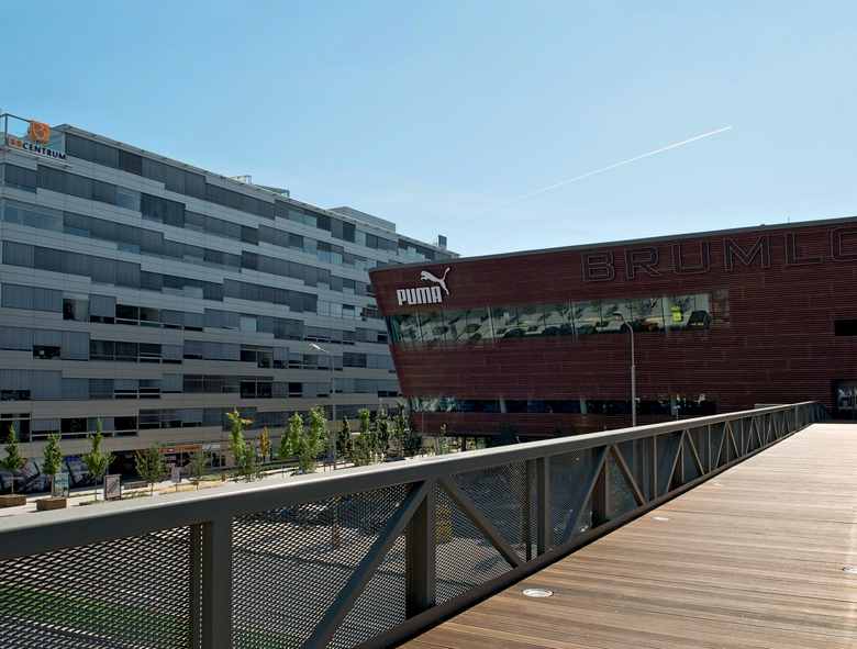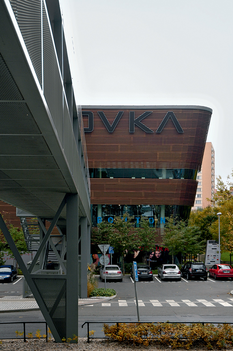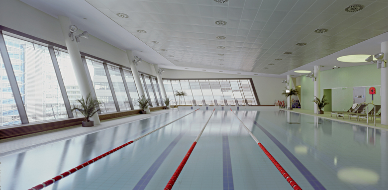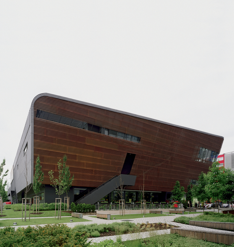 The wellness center has two floors devoted to sport. A shed roof with a very slight pitch conceals retreating relaxation terrace that extends from the aqua-zone one level below from the gaze of the higher building. The ground floor has two restaurants, a post office, small shops and a bar. The building creates optical harmony between the centre and neighbouring office buildings. Its different architectural form suits its different function. With the exception of expanses of glass, the exterior cladding is made of perforated trapezoidal sheet metal, whose colour changes throughout the day.