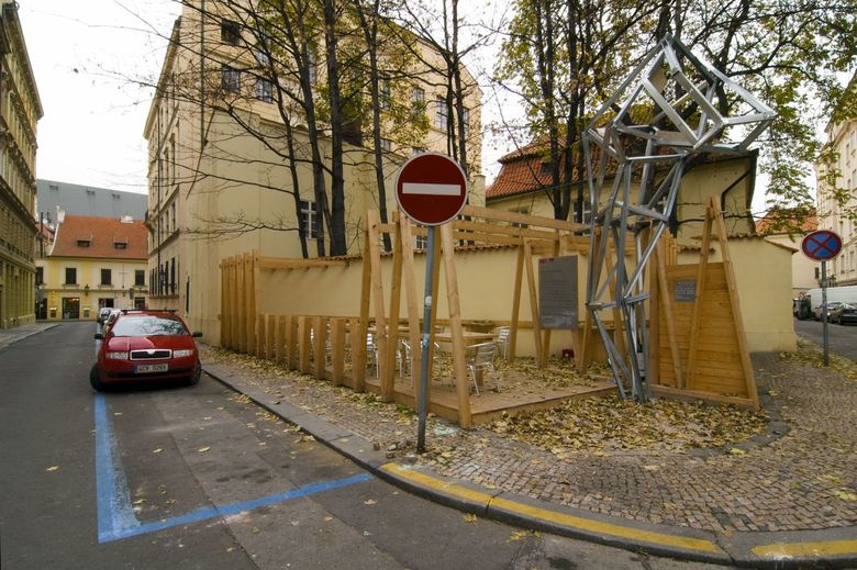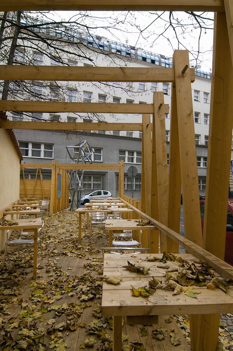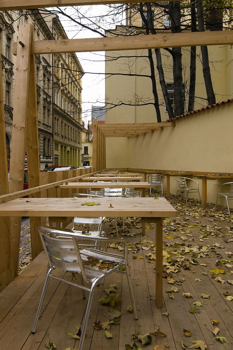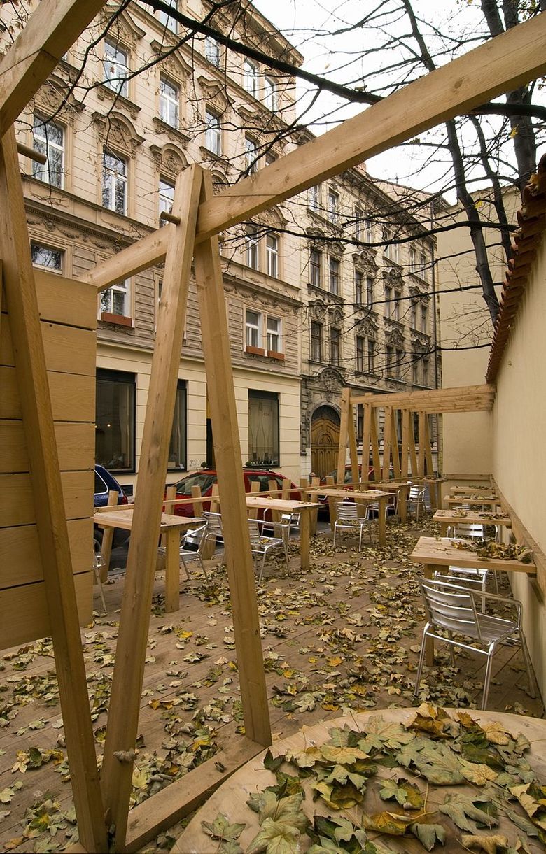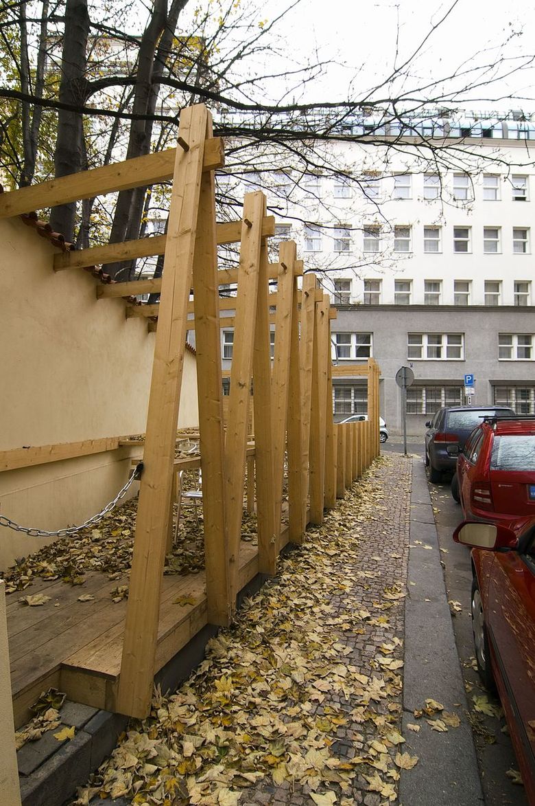 Last year we designed a front garden to the restaurant here – after obtaining approval from the owner of the site we only had to erect symbolic fencing from unplaned boards, turning it into a quiet place where people may sit in the centre under crowns of fully-grown maple trees. The wine depot owner enthusiastically accepted our idea that pieces of art by young artists could be exhibited in front of the entrance. Following an agreement with the Jarosav Fragner Gallery we installed the statue Sadrokarton story/Plasterboard story by Jakub Juráska here. Everything was finished in two days – mostly DIY – and ready to use.